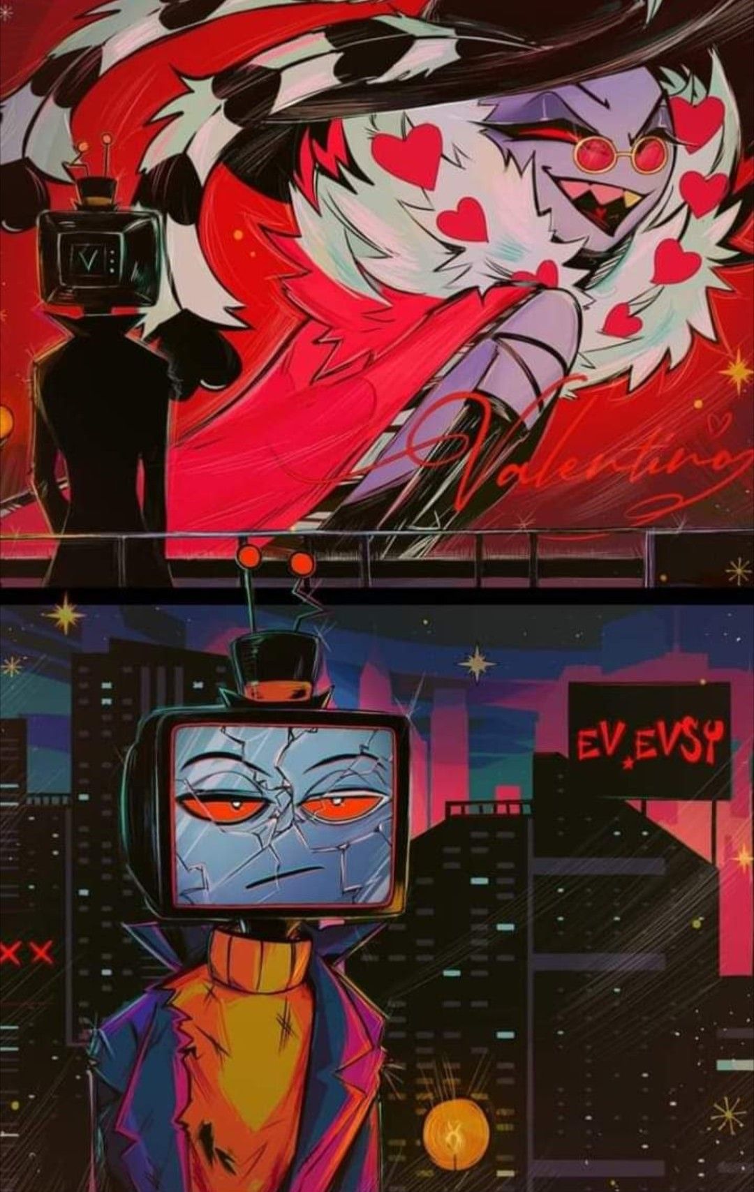>>153059527Yes! He probably won't get Heaven-redeemed, but will become a better person. The Vees will not abandon him, so at least there's that.Vox does love Valentino, but Val is a hoe (affectionate) and sleeps around with a lot of people and Vox wants to be monogamous. Their relationship is toxic, but it can be fixed if the two just open up to each other. Vox is understandably very afraid of being vulnerable, so that might not happen immediately, but I'm rooting for him. You can do it, Vox, you deserve healing. Getting over Alastor is the first step.Adorable picture too anon.>>153059838I have seen that, yeah. I want Vox to be redeem-worthy, but stay in Hell, so he doesn't have to be separated from Val, Vel and Shokwav. Unless all of them go together.