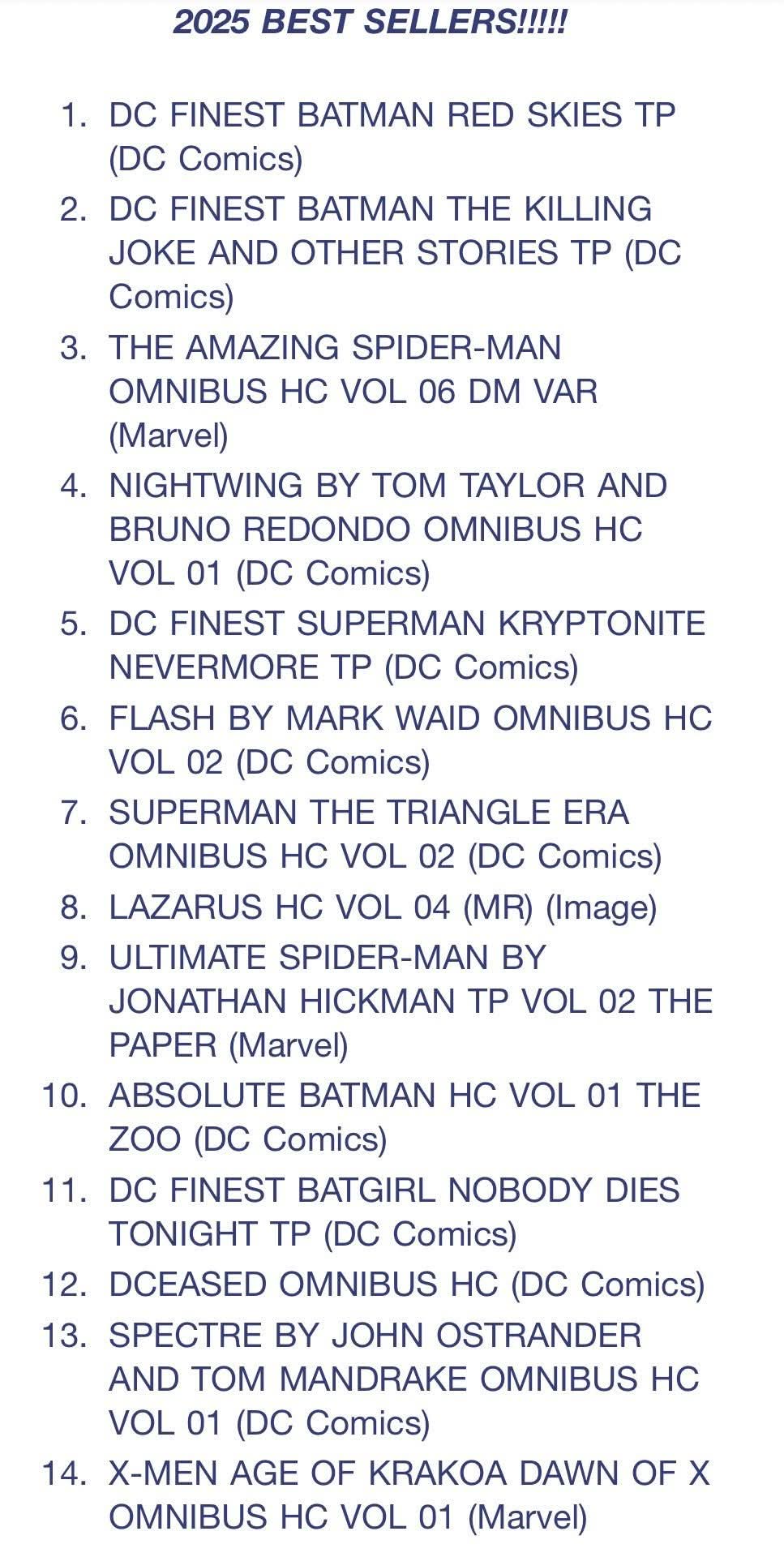 Looks like DC has revitalized its trades. Marvel needs to lower the prices for its Epics or something, not a single one in the top 50Didn't realize Lazarus was still so popular, I liked it back in the day but fell off