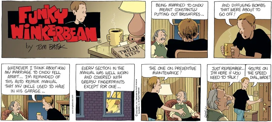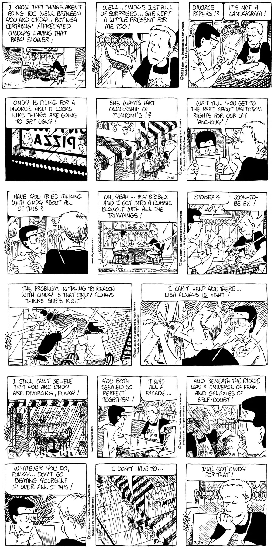 Previous >>151671718Today will cover 2001.Last time, John hired a new girl named Rach to work at the Komix Korner but being unable to pay her let her go where she subsequently got a job at Mononi's while Darin also took a job at Montoni's. Chien caused some problems with articles in the school paper first about the strictness of the school's new dress code and about bullying issues while Bull led the Scapegoats to their first legitimate football championship. Lisa discovered tha she had breast cancer though with chemo, a mastectomy and support from her friends and family, including former majorette and fellow breast cancer survivor Holly Budd, she was able to get through it as the cancer went into remission.But things weren't going well for Funky. His marriage to Cindy was beginning to fall apart as her career began to take off as she was given a job offer for ABC News in New York. Funky turned to alcohol to cope with the stress which turned into a problem when Cindy got the wrong idea after Rachel brought him home, he missed her flight and ended the year passed ou on the sidewalk in front of Montoni's.