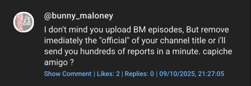 mekolai, the creator of bunny maloney, is going to mass report bunny maloney channel if they don’t remove the "official" in the name.source:https://x.com/studio_tanuki_/status/1976447720379260953