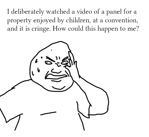 >>150772462I was there too. There were a tonne of people who kept shouting out weird stuff including while the panelists were speaking. Imo it was pretty annoying and embarrassing in a second-hand way. A thought crossed my head during the panel; if I was the show creator on that stage, this would be the point I'd start intentionally sabotaging or messing with my show. Especially to weird out the parents who bring their kids to these panels. I'd make my show as dark and gritty as possible out of pure spite. And then I realized this is maybe what Goose has already been doing