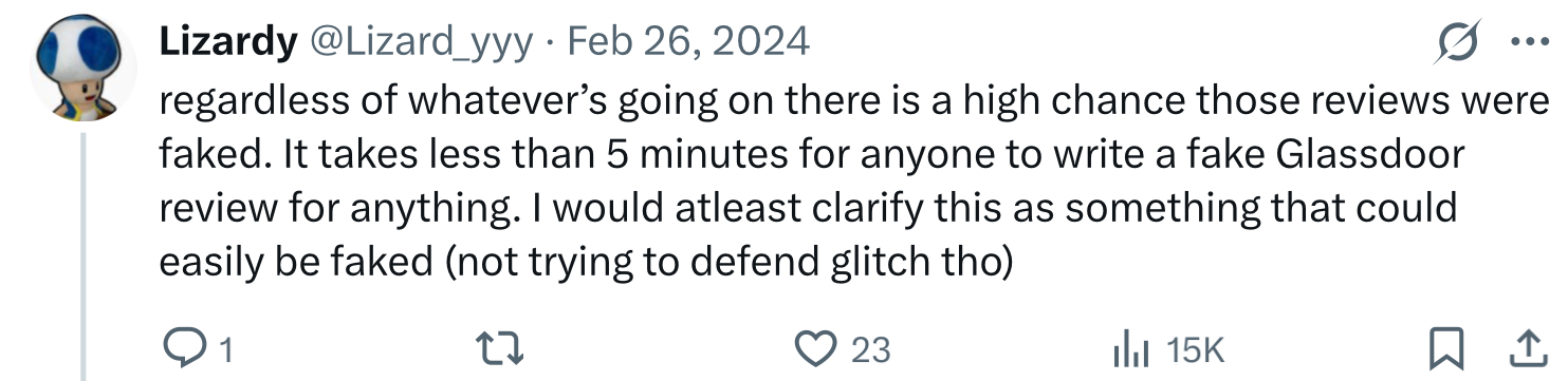 I heard that Glitch Productions has the worst reviews of any company ever on Glassdoor. Can someone show them to me?