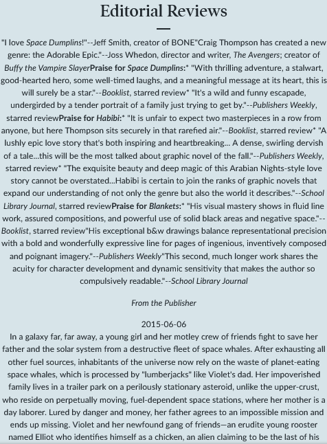 >>150830594I assumed this was Blankets vs Habibi but after looking up the dates it's more likely to be Habibi vs Space Dumplins which is some young kids graphic novel that came out in 2015. Was it that bad? I never even heard about it.