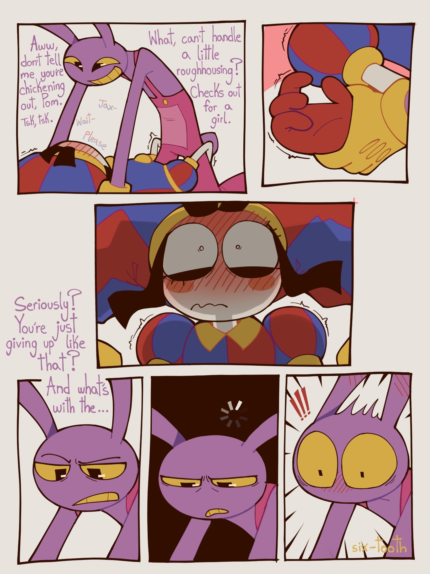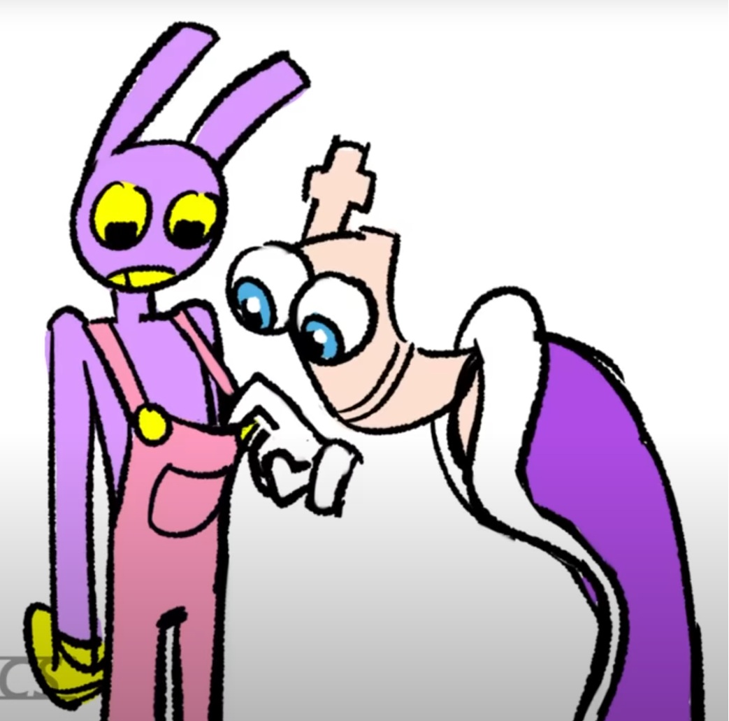 >>150848025Jax and Ragatha hate each other because of their history, there is real pain there. And their relationship has gotten worse since the 4th and 5th episode. Jax and Gangle is a relationship of replacement. Jax uses Gangle to replace having a friend by forcing her to play his games his way. Gangle doesnt even know his because she came after Ribbit abstracted. When Jax is ok, him and gangle get along alright, but that just makes her more scared, never knowing when Jax starts feeling too comfortable and lashes out. Pom and Jax dont have a history, she actually likes him when he's cool, and finds his humor funny sometimes. She is seeing the end of his breakdown, and unlike the others is challenging him on his behaviour instead of just going along with it and hating him.