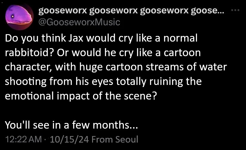 >>150872465>It'd be funny if Jax just got worse and ended the show on a "not good but not doomed" note.I think that is exactly how it's going to go and that's why goose was so adamant about how people would end up being so divided by itI remember someone saying how the ending may tackle the theme of 'who deserves to be saved' and 'just because you aren't winning them doesn't mean you are losing them too' with both Jax and Caine.