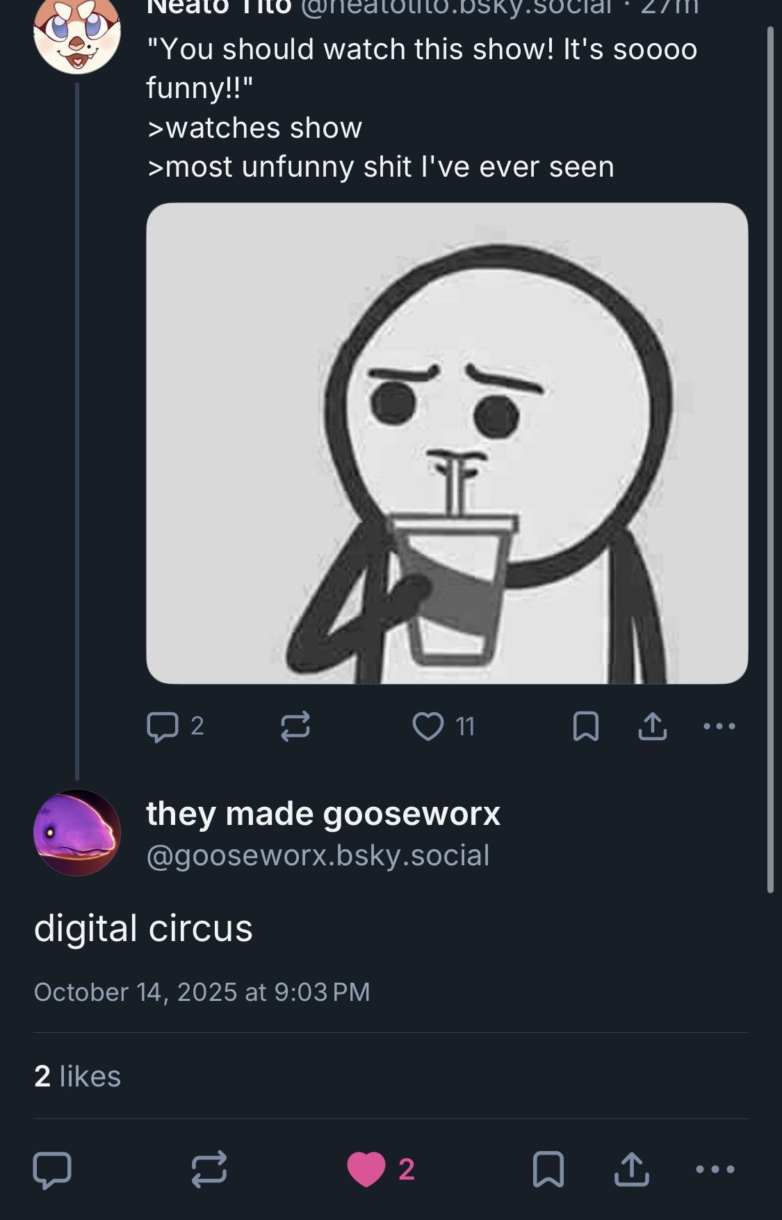 >>150848153probably because its the most nothing relationship ever, it seemed to just popped out of nowhere in the middle of episode 4 when nothing was ever implied these two were close at allso is Ragatha and Pomni but that averted the rule for reasons I dont know