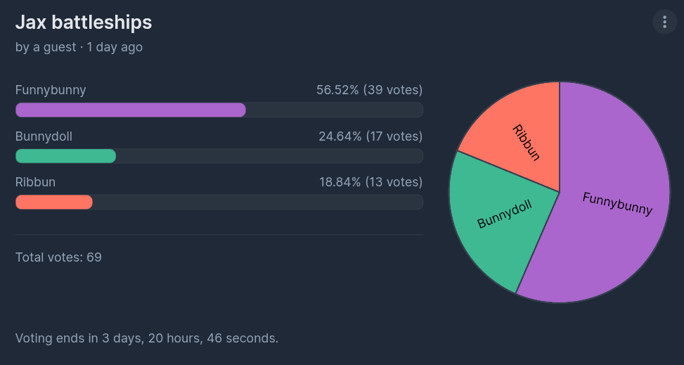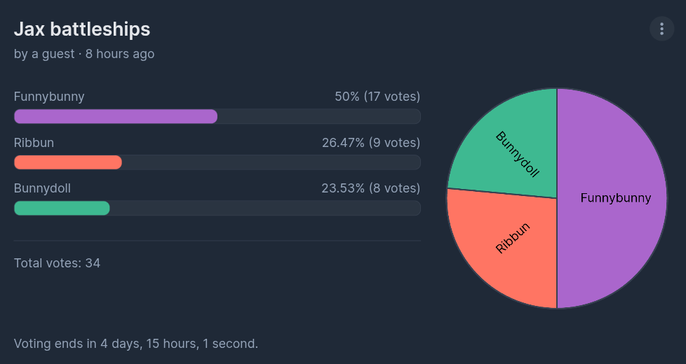 >>150845013AnthonyMoose here with updatesRibbun is currently leading with funnybunny second and bunnydoll last, I am proud of you all. RIBBUN SUPREMACY