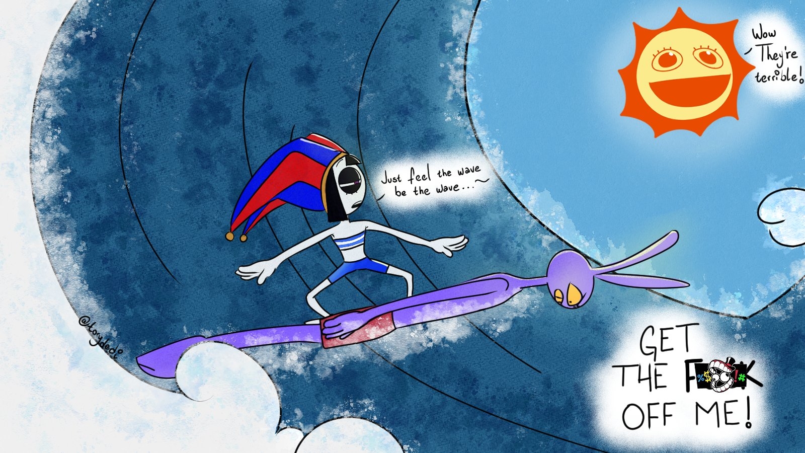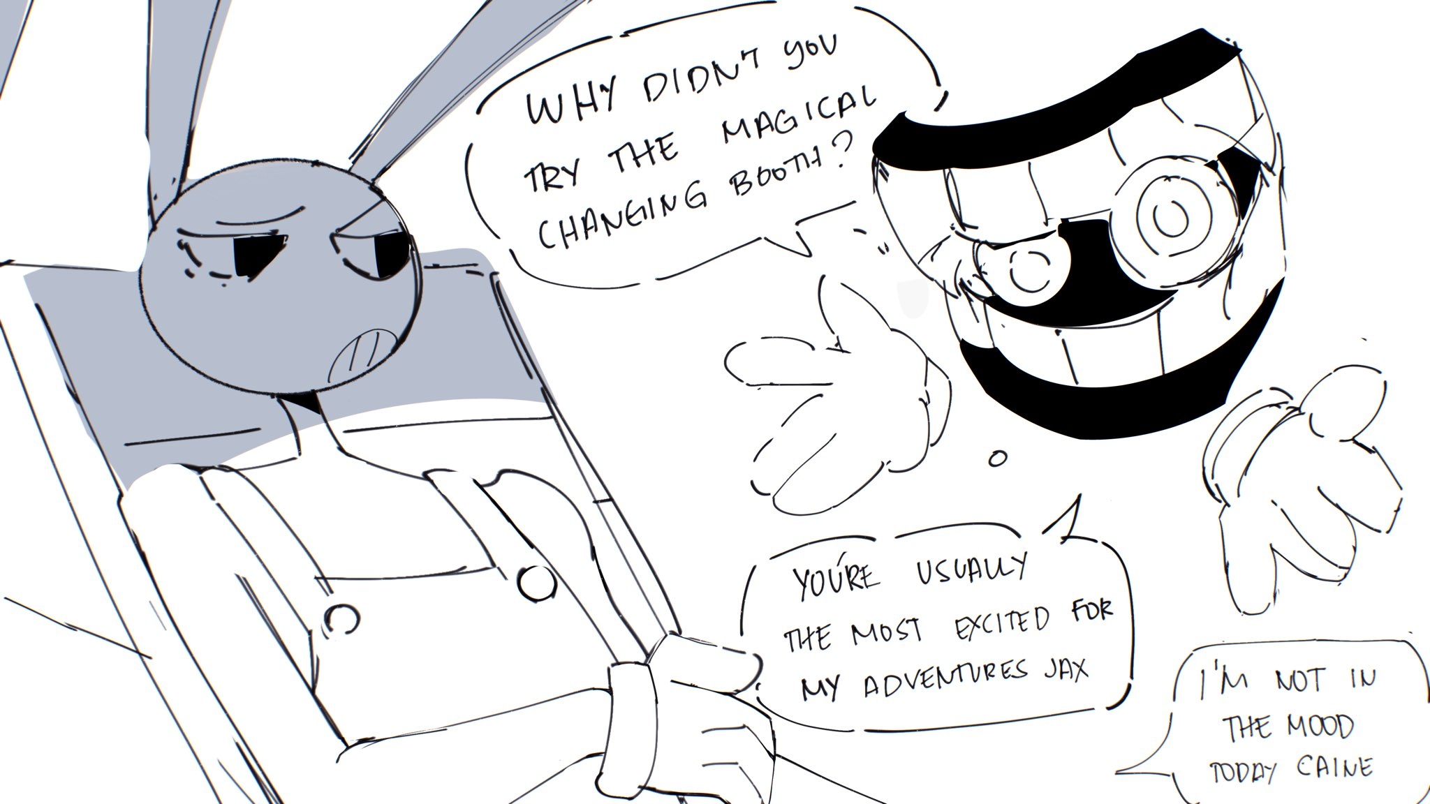 >>150845299Probably didn’t help that his best friend abstracted and had to make do with Kaufmo but at that point he became obsessed with escape and clearly terrible company.That might make for a fun idea though a new guy enters the circus and Jax is constantly on him. Either ribbing him and hanging around him every time. Eventually the two develop a friendship through being assholes to one another.