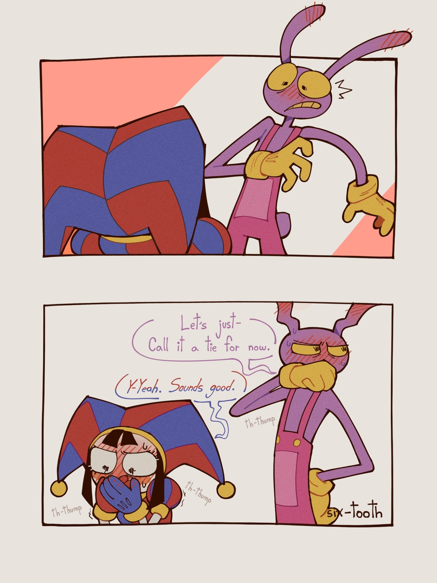 >Sex Update™ gets introduced, much to everyone's surprise >Caine admits he's letting it thru because he believes it could be a great educational and team building activity that will reduce conflict between them>excitement is through the roof>sooner than later the reality settles in that everyone is terrible at sex, mind bogglingly so>Kinger and Ragatha have been there for so long that stimulation does nothing to them and even if they wanted to have relationship with anyone it would absolutely not be the current roster>Jax is embarrassingly virginal >despite being a freak in the mindscape Gangle is also just as much of a virgin as Jax>Zooble does have experience but the things that gets their socks off are too niche to or sm to everyone else>Pomni is extremely awkward about it>less than a week passes before everyone is almost begging for him to roll back the update out of sheer embarrassment and cringe towards each other>hfw