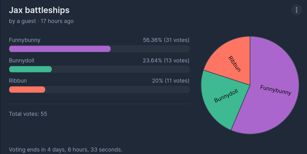 >>150845013Funnybunny is going to win in a landslide. It shouldn't because it's boring as fuck, but it will.