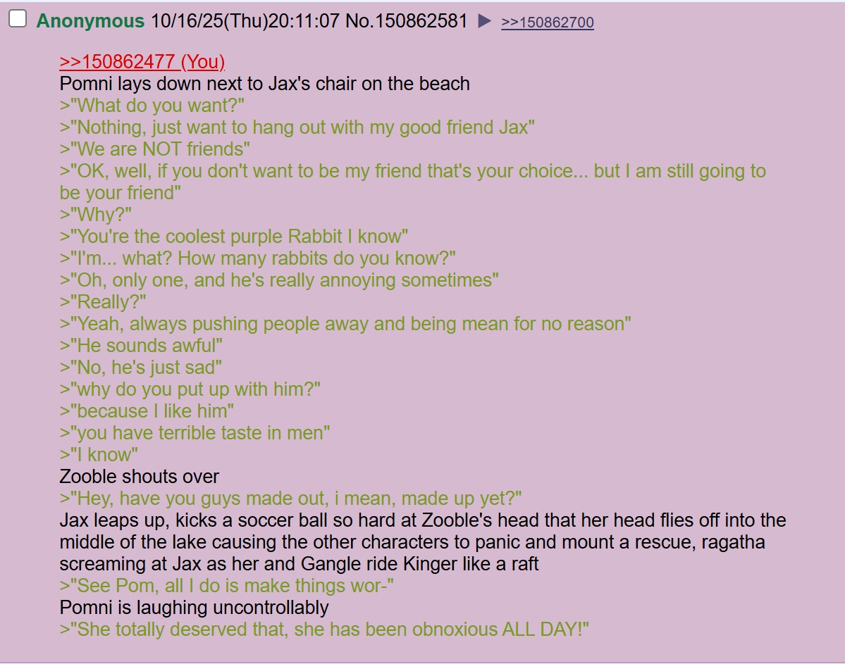 >>150872007>But I guess Pomni isn't broken enoughi think after Jax's cringe outburst and her rather deciding to spend a day at the beach and have fun with everyone else will give ragapom enjoyers a new leg to stand on but we'll have to wait and see