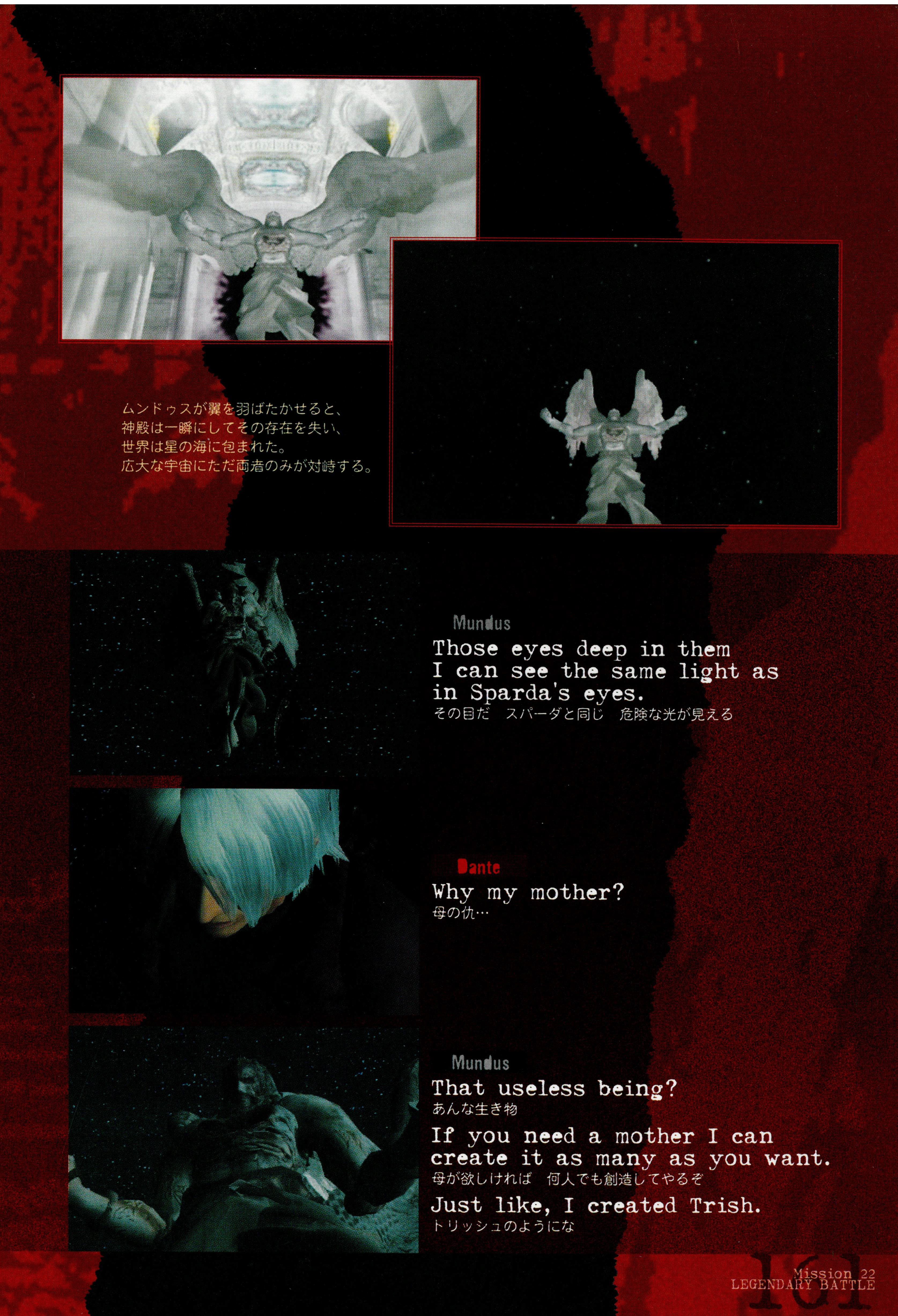 >By the way, the movie parts outsourced to the contractor were: the opening “crystal ball Mallet Island” sequence, “statue shatters and Mundus appears temple goes to space,” “appearance in the sewers,” “Ebony Ivory bullet hits gets sucked in,” and the ending... well, spoilers aside, the big explosion part... was there anything else...?"TEMPLE GOES TO SPACE"??? YOU MEAN HE DIDN'T SHIT OUT A UNIVERSE AND DANTE WASN'T STANDING IN RANDOM SPACE DURING THE CUTSCENE?? KAMIYA-SAMA HAS BETRAYED US