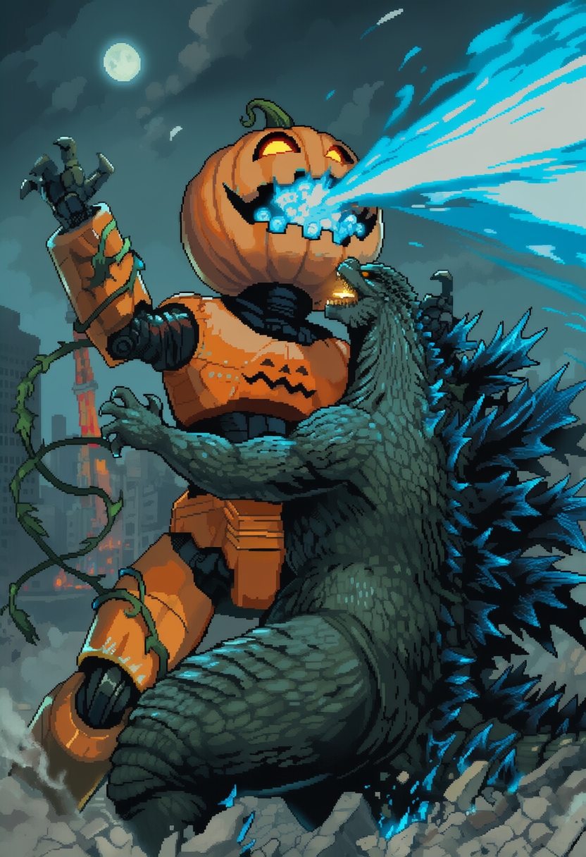 >>150860412>They did the Mash>They did the Monster Mash>>150860444>>150860493I love the Pumpkin-Bot using Godzilla's own atomic ray against him.Nicely done, anons. Thank you kindly for indulging me.