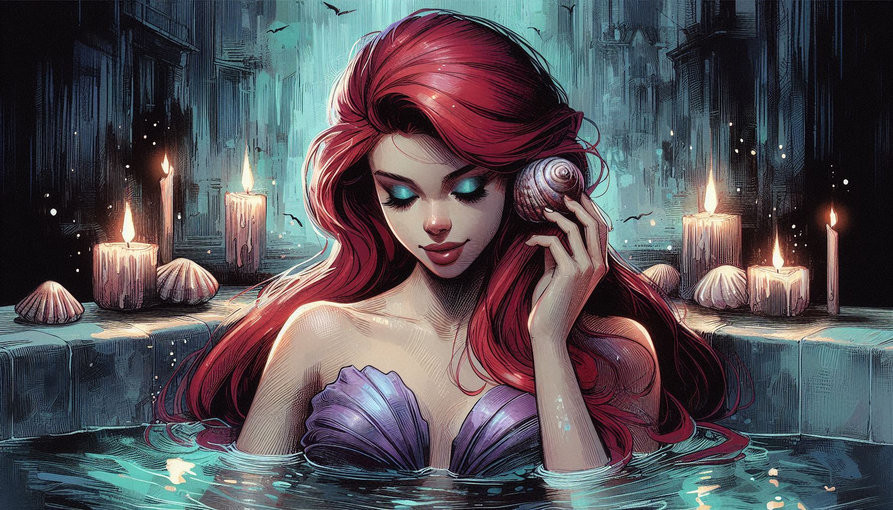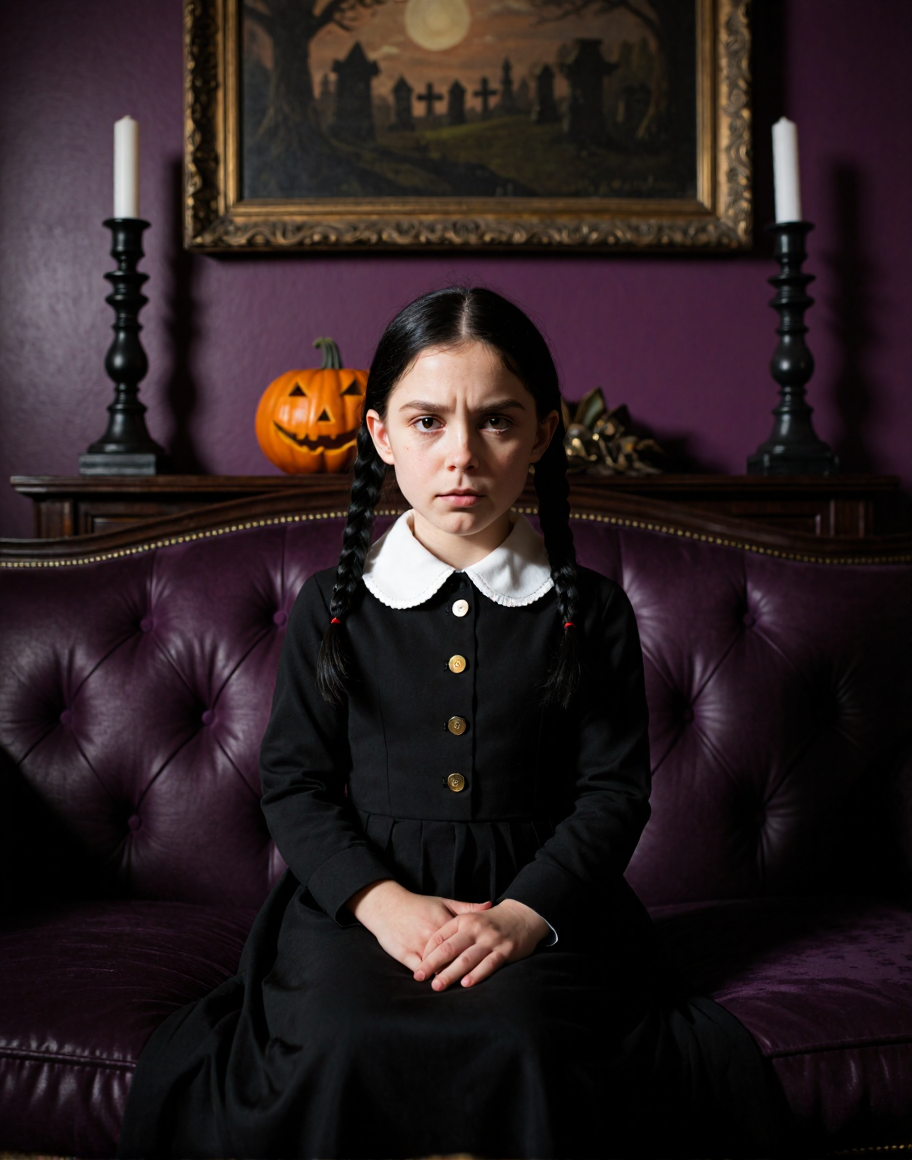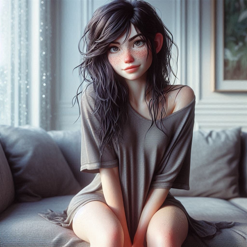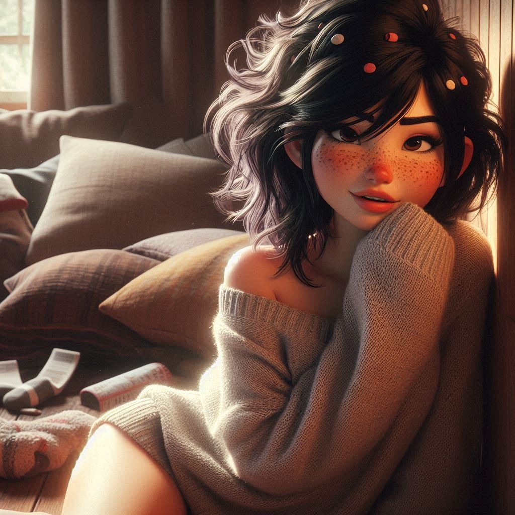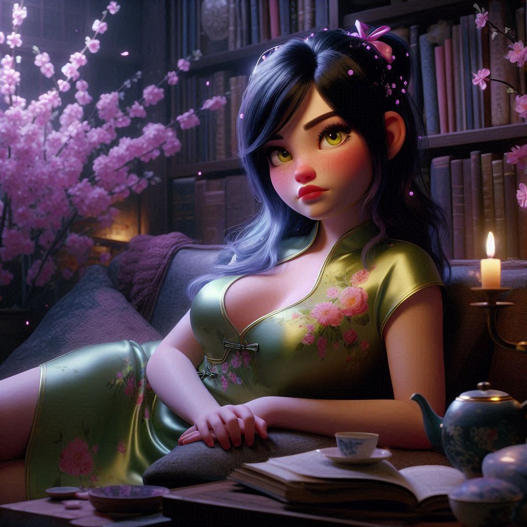 >>150887959> high quality digital illustration, closeup on face slightly from profile of Vanellope (long messy dark blue hair,yellow eyes,plus sized,sultry,,chubby curvaceous figure) relaxing on a couch in a dark reading room (full bookcase,flower pots,sakura petals,steaming kettle,tea set) ,wears lime satin floral sleevelss qipao,nighttime,dreamlike lighting,pink haze,realistic texture