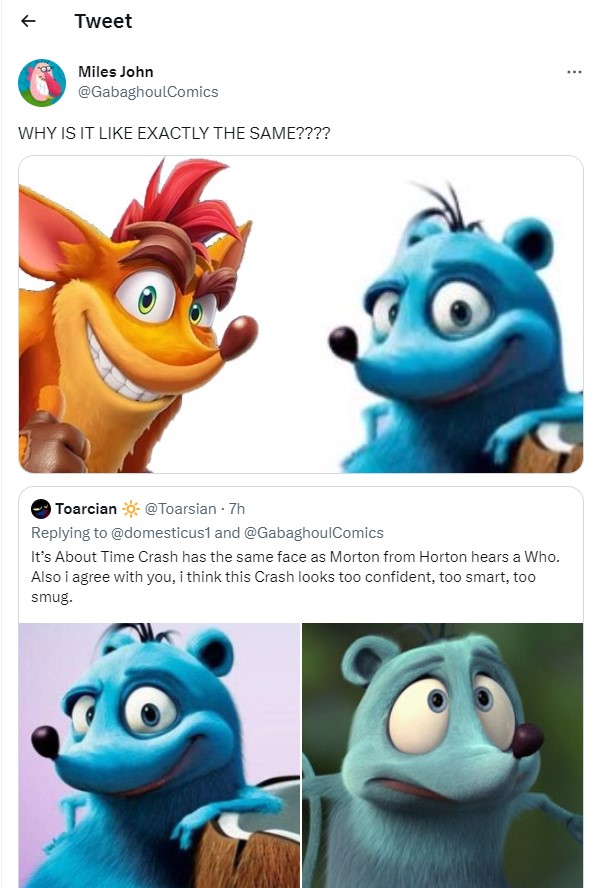 >>150877617Toys for Bob just doesn't know how to make the characters look crazy enough, don't get me wrong crash has always been a very furry franchise but it had those Sunday morning cartoon vibes and tropes that people loved