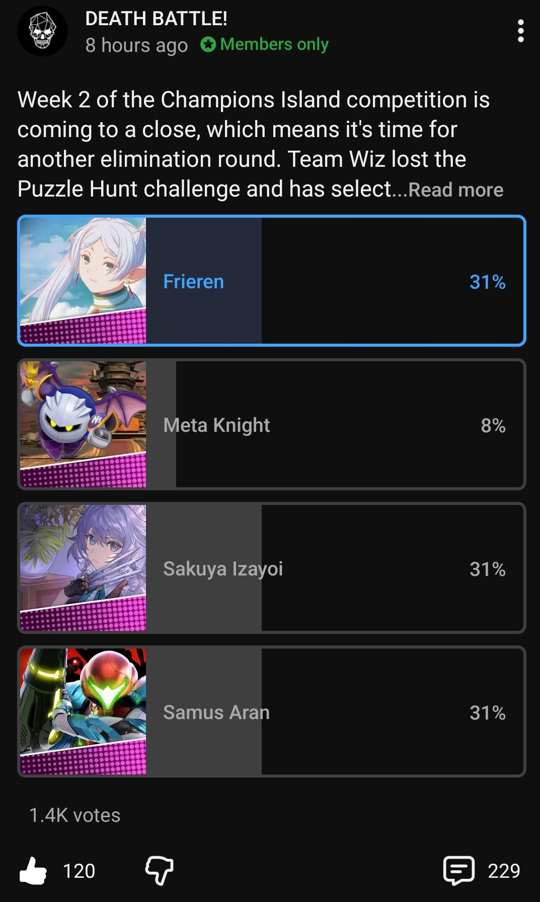 >>150885507He was one of the most submitted Kamen Riders for this event and his matchup spread (Asura, Bayonetta, Liu Kang, Sephiroth and Sailor Moon) probably got the team's interest.