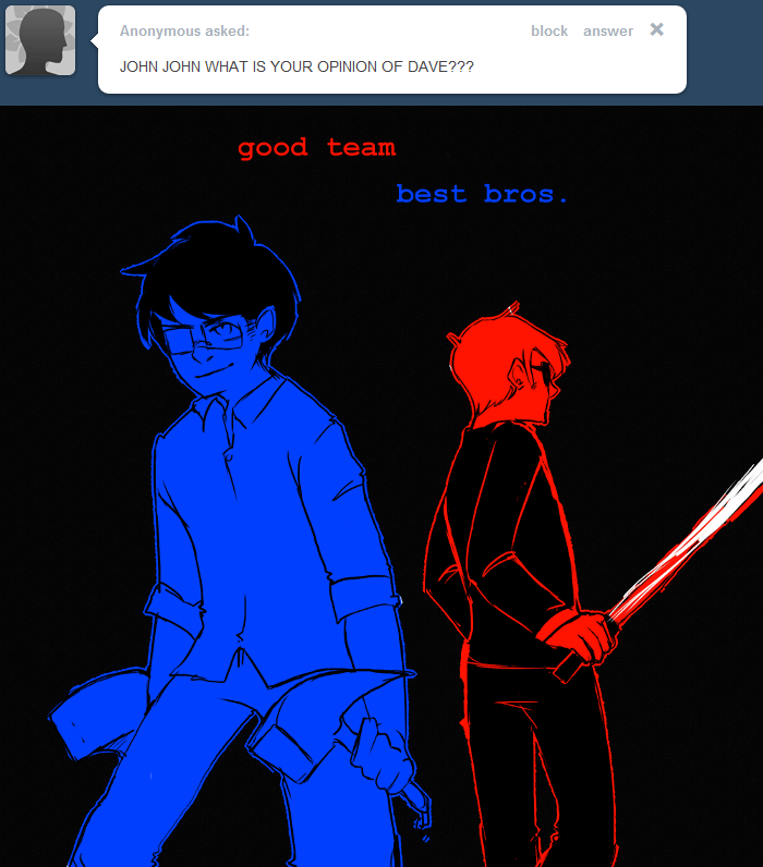 >>150902133>Humans all having bright red blood was because Karkat wanted a world where his blood color was 'normal' so he wouldn't be alone.Thats an interesting idea. I can see the logic, but I always just assumed single color blood was the consistent default, since all the carapacians and leprechauns have red blood too.