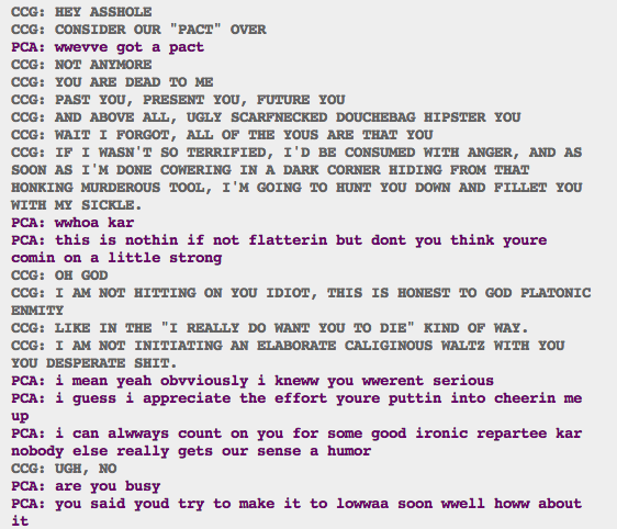 >>150909325FCG vs CCG while Jade watchesThe RRPT memo in A5A2The shipping chartCCG banned FAG from responding to memo.CCG: LATER, FAG.I genuinely think Act 5 Karkat was the funniest character in the comic