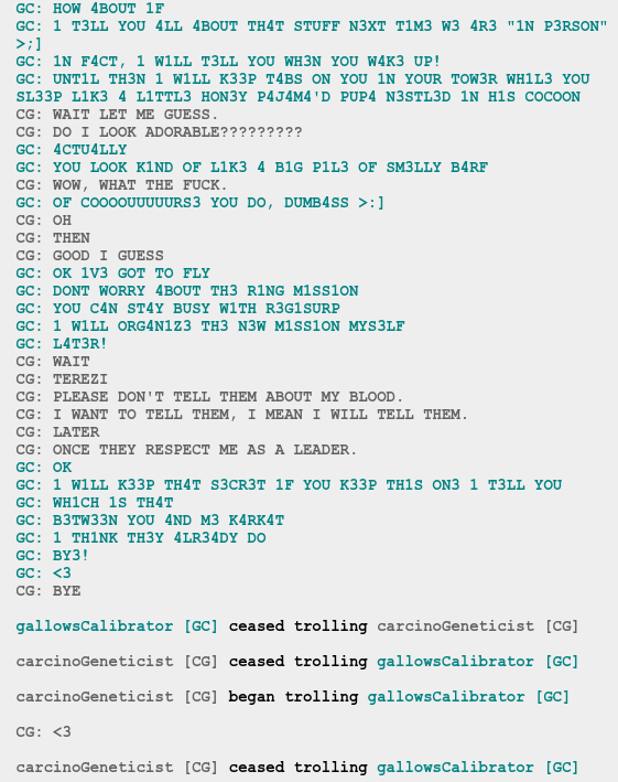 >>150900467Me, Eridan, Equius, Karkat, Sollux, John, Dave, Jade, etc. etc. It could've 8een anyone, may8e even........ (You)