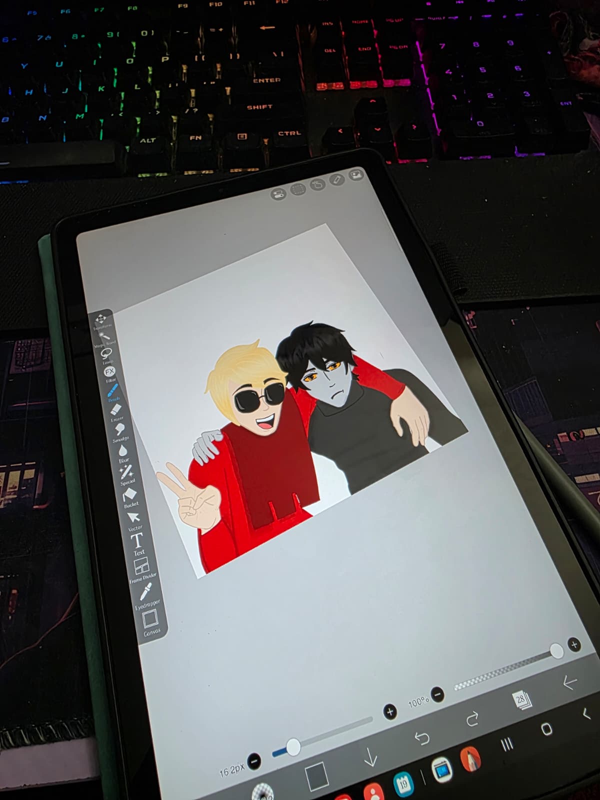 >>150916613never bin your art. keep at it and redraw it later to show how much you improvedit's cute so far. dave's front part of cape looks a lil too long but otherwise it's nice, anon!