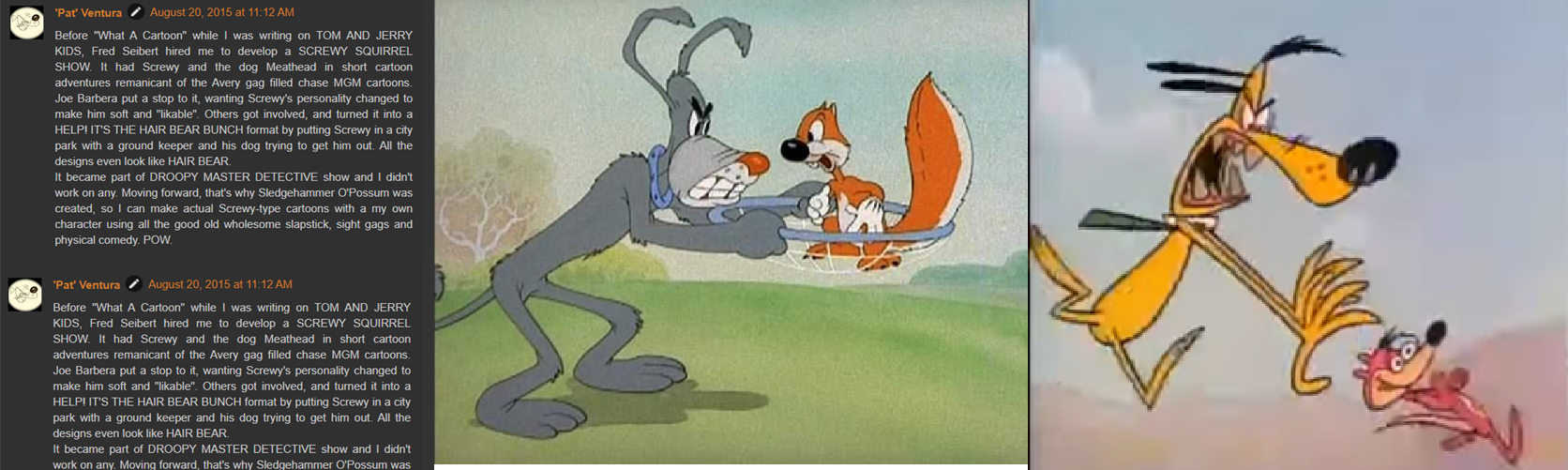 Fun fact to keep the thread alive: Sledgehammer O' Possum from What A Cartoon was made because Pat Ventura was denied a Screwy Squirrel cartoon by Joe Barbera himself. The modernized Screwy was used in Droopy, Master Detective. https://www.youtube.com/watch?v=lXHcaJf4GeQ
