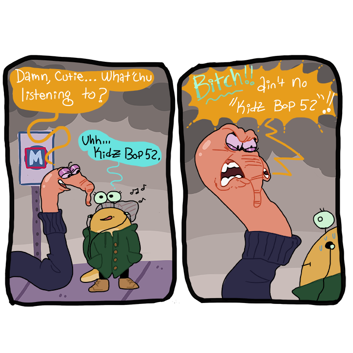 >>150908797>large group of adult men>suddenly artist and their pet are terrified>>150908894>bitch, aint no kidz bop 52!Ok, the worms are stand-ins for black men.