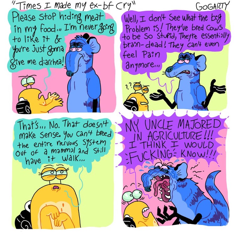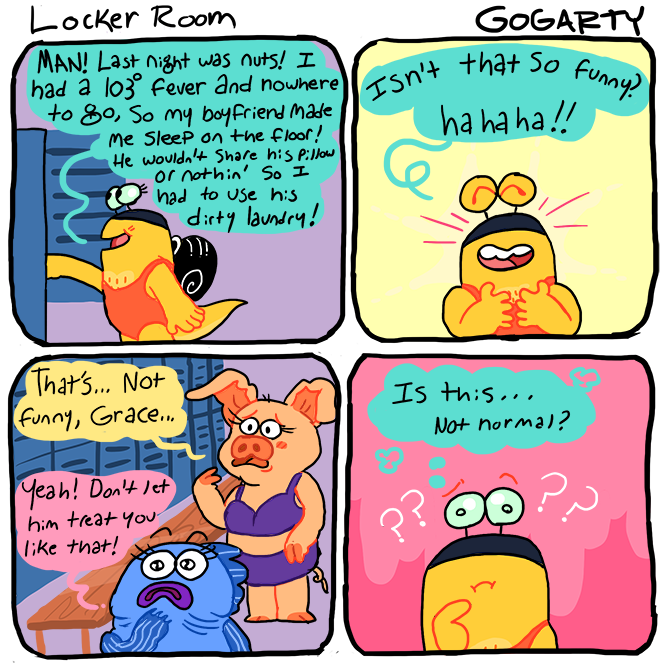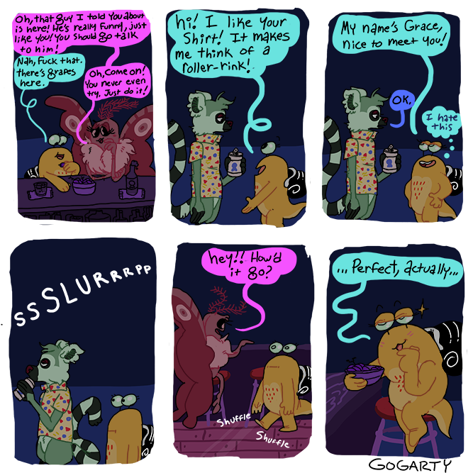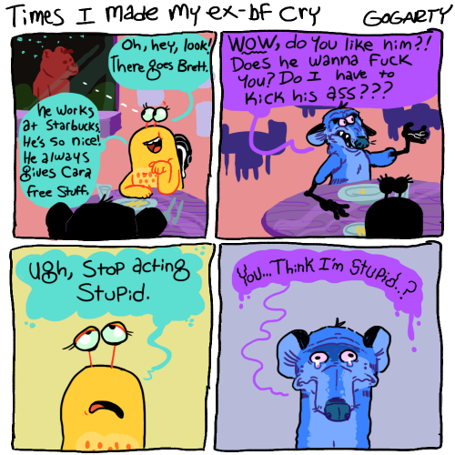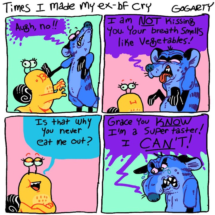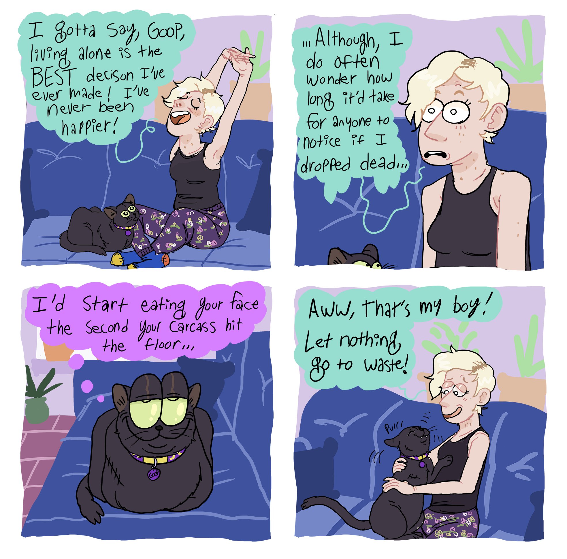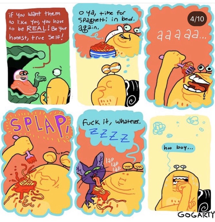The only source of joy and validation this woman seems to experience is thru others or pets.Every comic about her own actions is self depreciation or outright expressing depression. No wonder she stuck with disgusting rat boyfriend for so long, she sees herself as his equal.