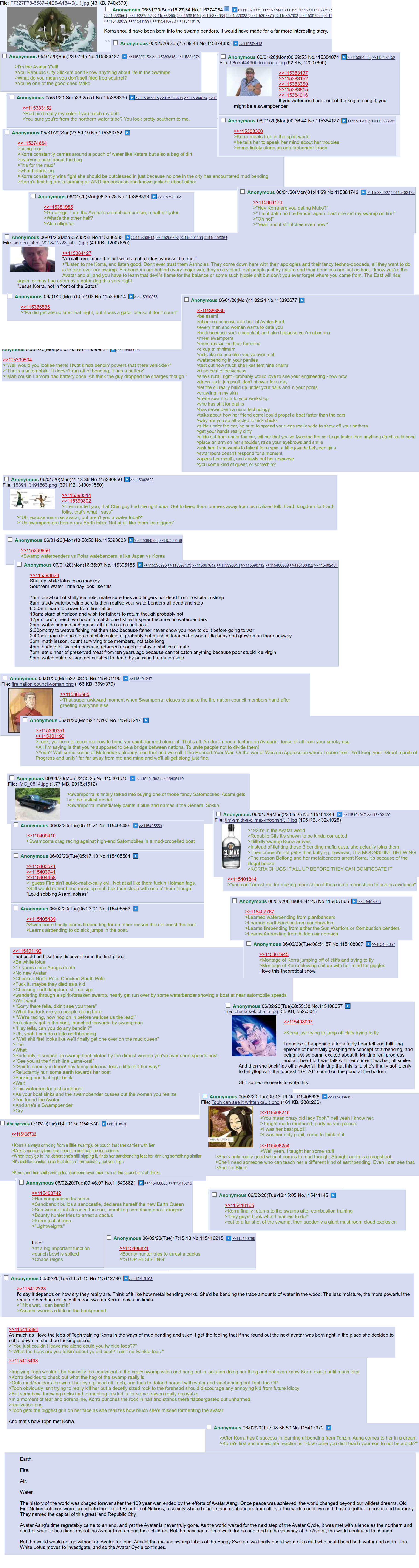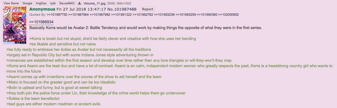 >>150939630Here's my pitch:Setup>Korra is abandoned as a child when she uses firebending for the first time, as her Southern parents have a deep seeded hatred for the Fire Nation and her parents assume infidelity rather then her being the Avatar.>Alone in the icy tundra, Korra is raised by Polarbear Dogs and learns Waterbending to catch fish and Firebending to cook and keep herself warm. She does not think anything of it and assumes anyone can bend two elements>She is later discovered as a teenager by an Elderly Katara who is searching for the new Avatar>Katara takes this Tarzan like girl and teaches her how to be a part of society but Korra is heavily resistant leading to some comedy and hopefully make her endearing and not insufferable>Finally she sends Korra to her son Tenzin to begin Airbending trainingBook 1>When Korra gets to Republic City, bending is highly involved as a source for their technology and benders are prioritized for work in the city (Earthbenders push trolleys and work construction, Firebenders burn coal in power plants or work as chefs, Waterbenders make waterpaintings in the street and manage the harbor, etc)>Many of the homeless are nonbenders>Equalist Revolutionaries rely less on technology and are more Ninja esque with their tactics (Acrobatics, Chi-blocking, Shuriken throwing, and Poison Gas)>The Police Force are Silver Samurai, they use swords as well as Metalbending>Amon isn't a bloodbender, and his origins of Bending oppression remains>He learns Energybending by communicating with the Spirits>The End of Book One ends in the opposite way, Amon is vindicated in the eyes of the nonbenders after being attacked by the Avatar and sparks revolutions across the globe, Korra has to escape Republic City as it has been taken by Amon and his followers