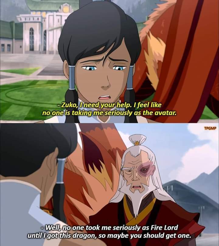>>150941925the treatment of Korra's character almost feels misogynistic at times>gets introduced with a huge ego (this is meant to be both witty towards the audience, while also the introduction of how Korra's ego is "bad" somehow)>her ego and lack of common sense lands her into trouble (even though it paints the people who raised her as retards but you're not supposed to have that takeaway)>is then violated/broken/tortured by evil men, made helpless and then finger-wagged for not listening to the men in her life