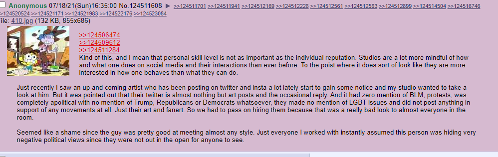 >>150953848How was that anon wrong? Typically when someone 100% hides their political views, then they are something to hide. That artist likely was some chud bigot asshole and they might have been totally correct in passing on them.