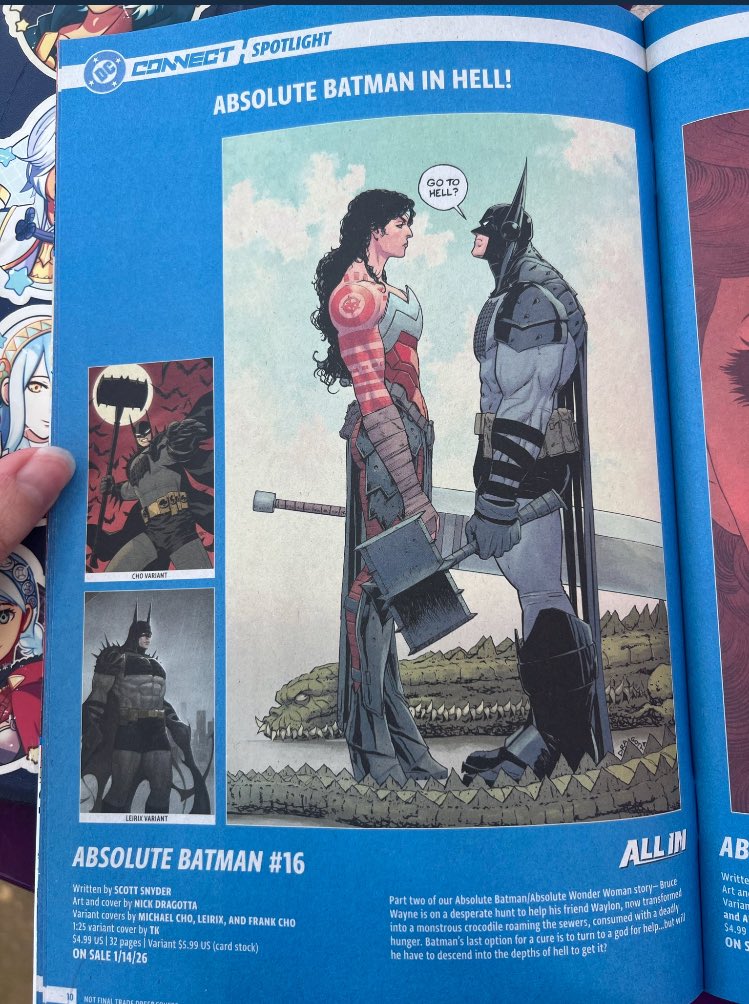 >>150951679absolute covers for my absolute bros:Absolute Wonder Woman #13 Cover B Derrick Chew VariantAbsolute Wonder Woman #13 Cover C David Talaski VariantAbsolute Wonder Woman #13 Cover D Marguerite Sauvage Variant>To save the world from an all-new supernatural threat that Diana is uniquely unqualified to solve, she will have to reach back to the oldest and deepest of gods for their assistance. But they may not agree with her position. In the midst of this struggle, a new player makes their presence known, but are they friend or foe? Concluding a two-part guest arc from visionary artist MatÃas Bergara!>BECAUSE YOU DEMANDED IT: THE FIRST MEETING OF ABSOLUTE BATMAN AND ABSOLUTE WONDER WOMAN! The first meeting of two Absolute heroes has arrived at last! The Mark of Hecate at a crime scene in Gotham draws Wonder Woman into Batman’s orbit in dramatic fashion. The world’s greatest detective and the world’s most famous witch must work together to solve a series of grisly and ambitious murders that threaten something much more dangerous coming for Gotham! And don’t miss January’s Absolute Batman #16 for the second chapter of this world-shaking meeting!