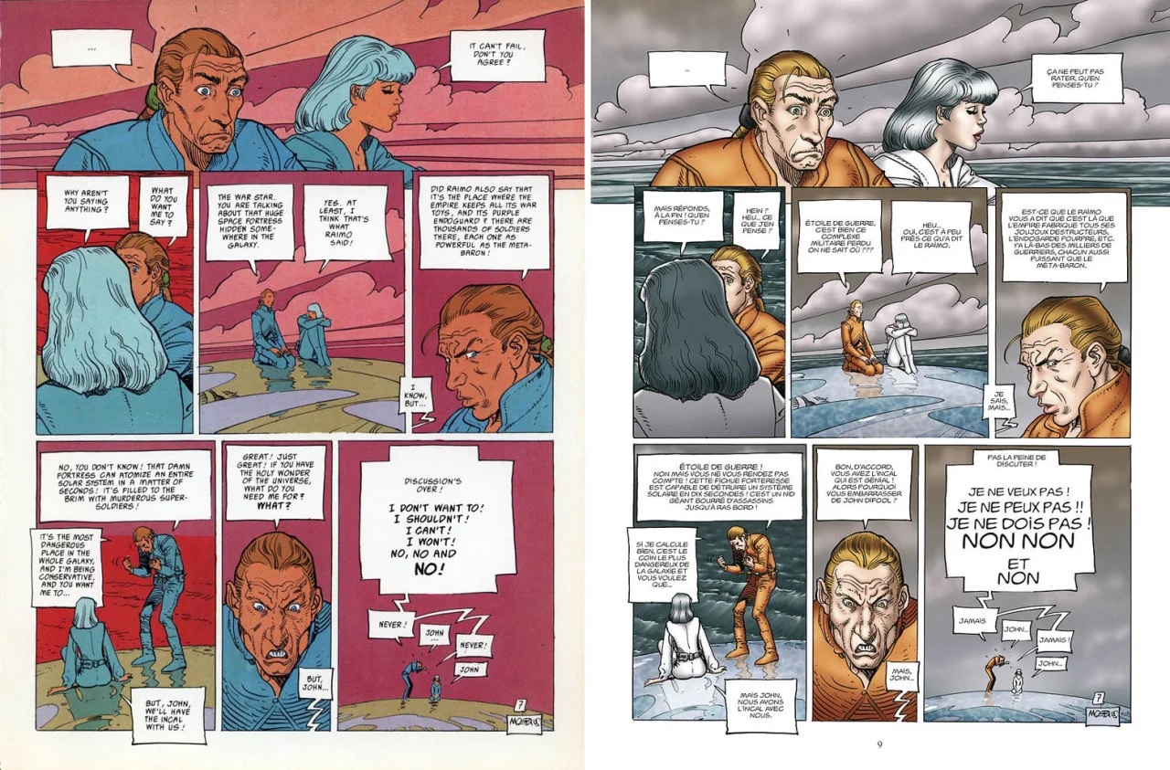 >>150965343There's an important note to be made about rendering. Pay attention to the hair in >>150965343 notice how in the recolour, the colorist has effectively interjected their own artistic choice about the rendering of the light. This is beyond their brief.It is the inker who determines the style of the rendering, not the colorist.To be more clear, consider pic related. It's not a particularly impressive page by any means, but there is a clear style in the in it. It has been drawn with the intention of being coloured flat. That is why the clouds are drawn the way they, they are almost geometric, they are to be coloured in a flat manner, not realistically. The recolorist on the right does not understand this, he rendered them realistically, but because the lines themselves are not realistic, it looks off.The hashed, almost stippled lines you see all over Moebius' art are a deliberate stylistic choice, they are meant to be seen, not obscured under detailed rendering that makes them look dirty and scratchy.I could go on, the red ocean, the clothes, the hair, Moebius drew with flatness of colour in mind, you cannot recolour this with realistic tones and rendering anymore than you can recolour Spongebob with realistic tones and rendering, it would look ridiculous.