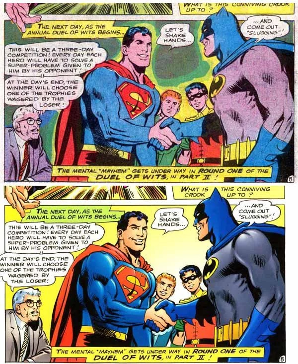 >>150965375And finally, to step away from objectivism and present my own personal opinion....Comics, particularly old comics, were cartoon. They were not realistic. The inker drew his inks with the expectation that it would be coloured in a very limited palette. The entire reason the style of hatching and large areas of black inks exist is because the Inker knew the colorist could not do those shadows, they simply didn't have the colours.Going back in decades later and adding those colours conflicts with the style of the inks. The inks are cartoony, they feature all manner of hatching, etc that pair well with flat colours to create an appealing and cohesive look. They do not pair well with modern more realistic colours and blending.