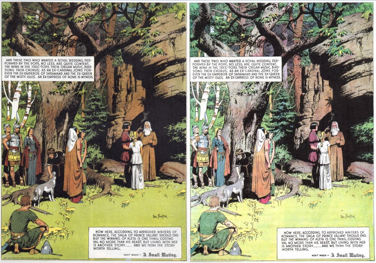 >>150965291When they later came around to do recolours, they approached it with a flawed technical mindset that if they use the same pigments but on cleaner paper, it will look good, but this is wrong. The colours on the right are WRONG. This is now how the comic is supposed to look