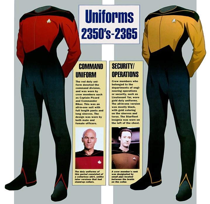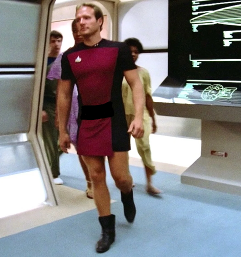 Despite the noble attempt at unisex, skirt-like uniforms in the first season of Star Trek: The Next Generation, they quickly realized, as we did as a society, that it's hard to take any military seriously if you can see your officers' knees. What is it about our exposed, fleshy, lower joints that screams, ''It's always my day off.''