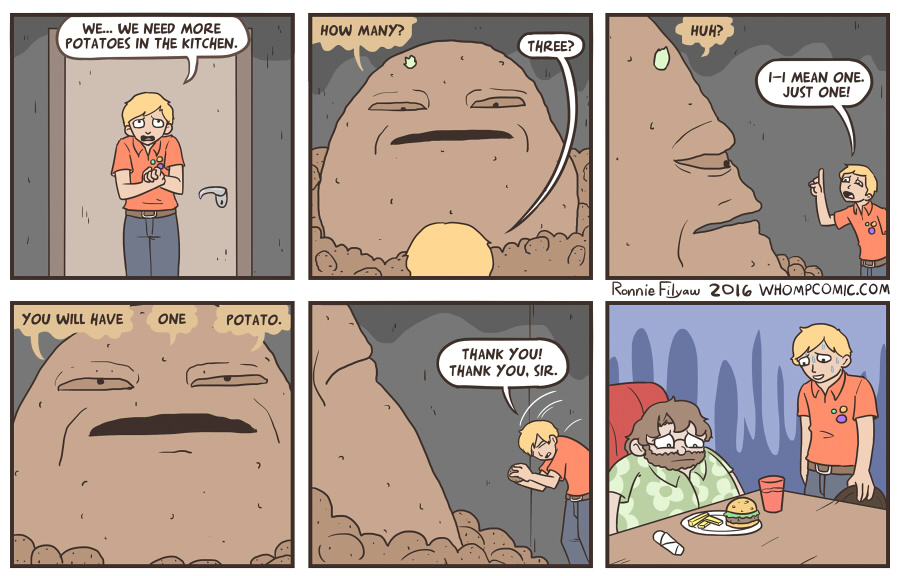 "I'm sorry, sir. We would bring you more fries, but Lord Spudhlx of the eternal hellroot galaxy has deemed to dole out only meager amounts of potato. I cannot go against policy, as his eyes are many. They cannot see, yet they can take root in your mind, creating starchy horrors unimaginable."