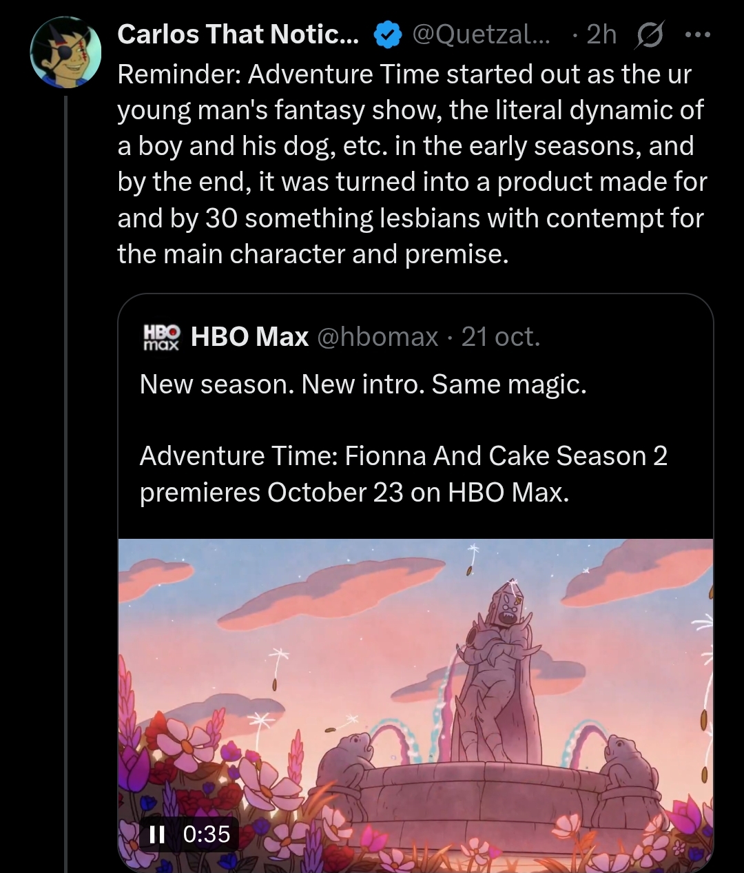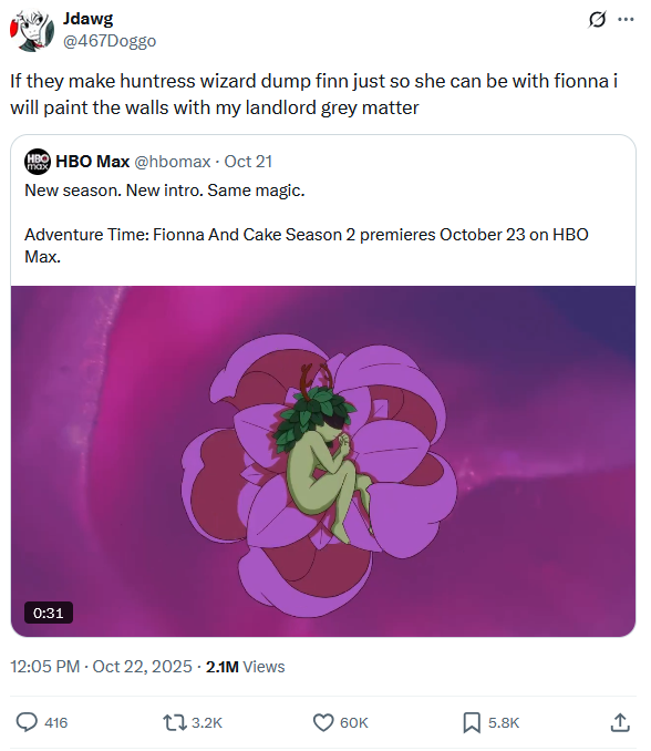It's hilarious to think that this season will show the split screen between Finn's inability to maintain a consistent or actual relationship with 1 girl outside of casual hookups, and Fionna basically getting railed everynight by male version of Finn's exes minus gary, but still hopeless with Hunter.