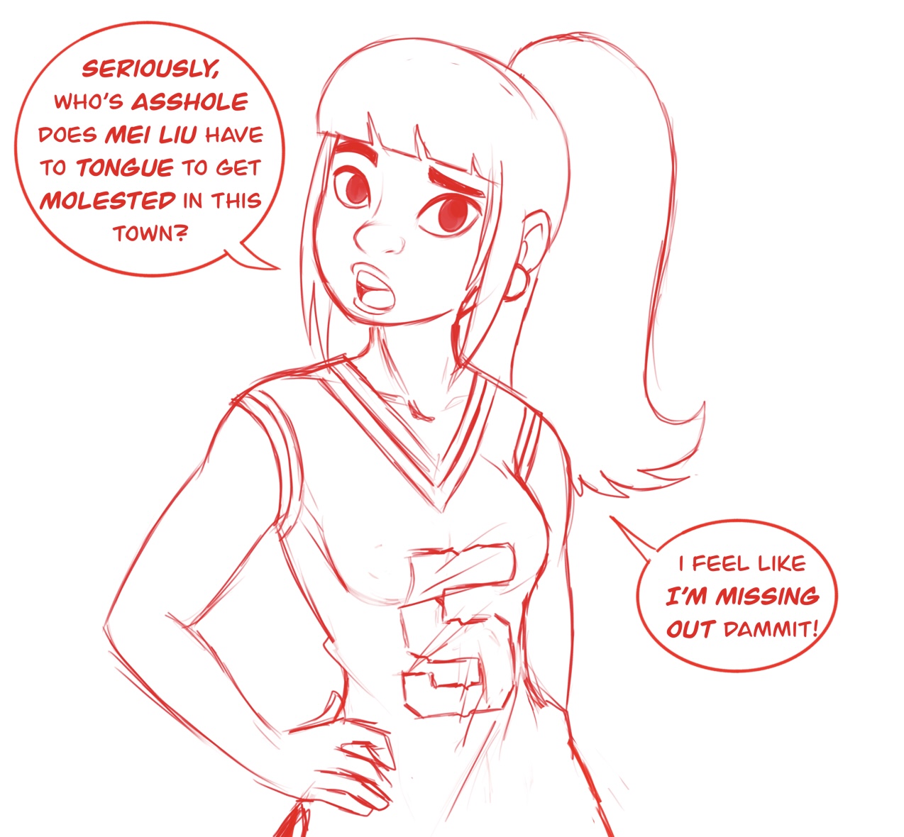 >"Tch! Mari you just don't get it! Why does Coach want YOU? He never gives me the time of day! Every single day it's "Mari come here, I need my balls polished!" Or "Mari, need a ride home? I got some tequila in here!" and what do you do? You pull the same slutty shy routine every time to make him want you even more!">"I-I'm sorry..">And here you come, whining to me about "ohhh nooooooo, Coach touched my butt!" while I'm out here starving for some attention! You know what happened last week? I went to Coach's office, locked the door behind me, said "Is there any way you can make me the starter for next season....daddy~?" and flashed him my breasts! Do you know what he did!? HE SENT ME TO THE NURSE'S OFFICE TELLING HER I WAS BITTEN BY MOSQUITOES!!!">"May Liu....">"I can't believe how selfish you're acting Mari."