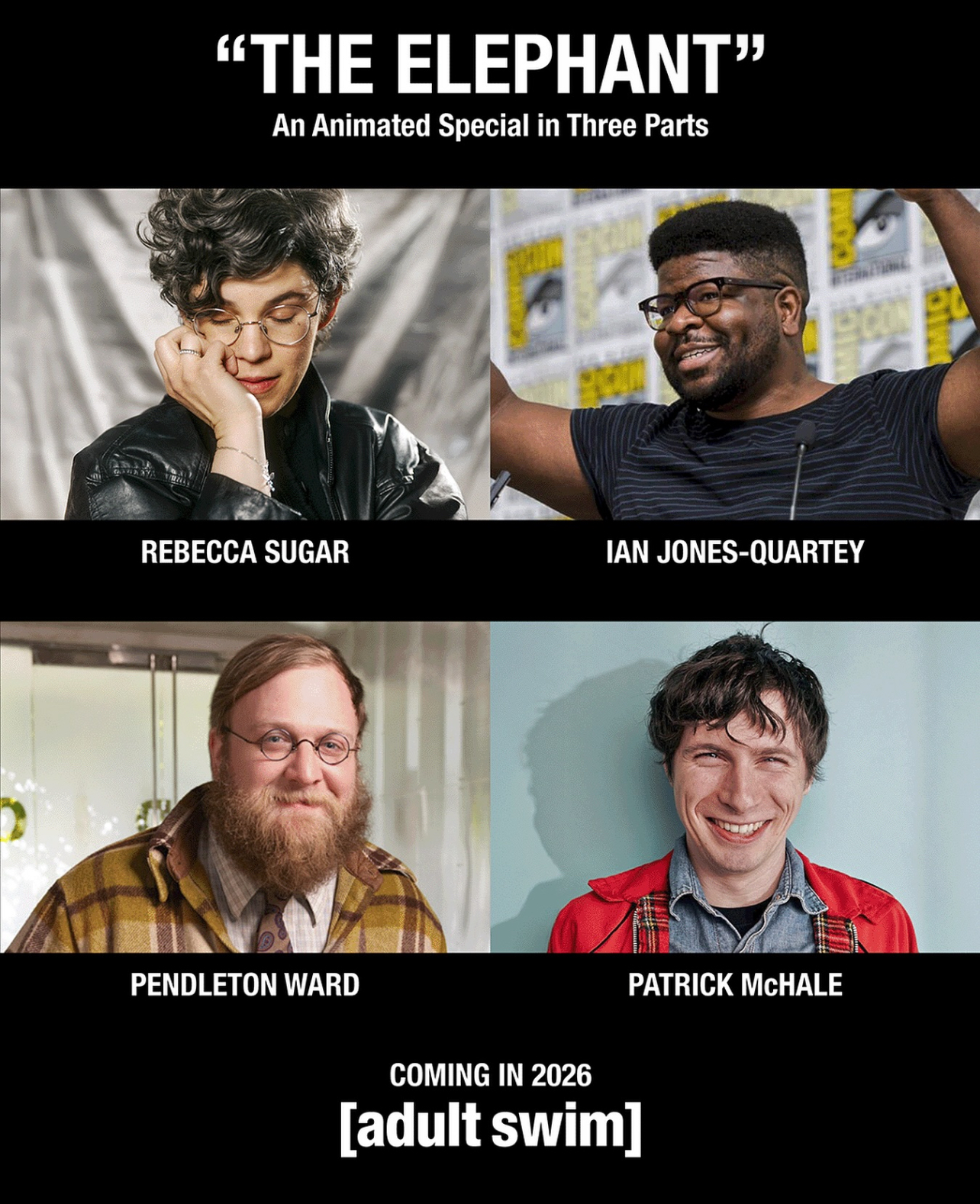 >>151021173>>151021727>Adult Swim’s The Elephant is an animated special where one team is responsible for one of three acts without any knowledge of what the others are making. With Sugar and Jones-Quartey working as a duo and McHale and Ward overseeing their own separate parts, The Elephant is guided by “game masters” Jack Pendarvis and Kent Osborne for a storytelling experiment that unfolds as a collaborative surprise, ultimately merging into a single, unexpected narrative.