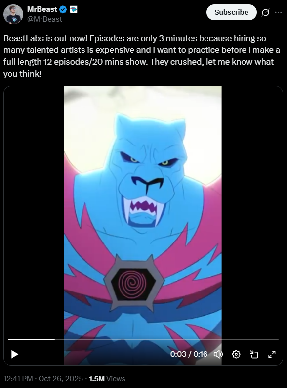 I've never liked him, but Mrbeast is a rare case of an annoying eceleb where people hating on him (xitter or sloptubers) ending up more insufferable, more desperate, and somehow, infinitely more self-serving than the man himself.But considering there's already an duolingo anime, it's no surprising animation is the next ad campaign for him: Watch my trash indieslop cartoon to save 100 starving african child per episode.