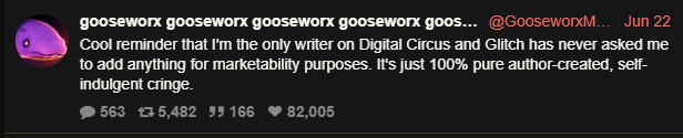 The characters in TADC feel like they're the fan-fiction counterpart of real characters.>well anon, what if that turns out to be a big brained 4D chess move plot point? what if it was all planned from the beginning and the digital circus actually warped the humans into becoming a flanderized version of themselves? bet you would feel silly then huh?This would just mean that Gooseworx is doing some texbook lampshading to cover up for their infantile writing. Anybody can do that. "Oh, my shortcomings are being exposed? Yeah well what if I acknowledge it and then talk about it? That way the power dynamic flips over to my side again and I'm in control!"Somebody who is just simply a good writer wouldn't have to do this whole song and dance. Somebody who's mature and has good observational skills would be able to write characters that are believable and interesting right from the get go, but the overwhelming majority of american millenials are neither mature or observational.