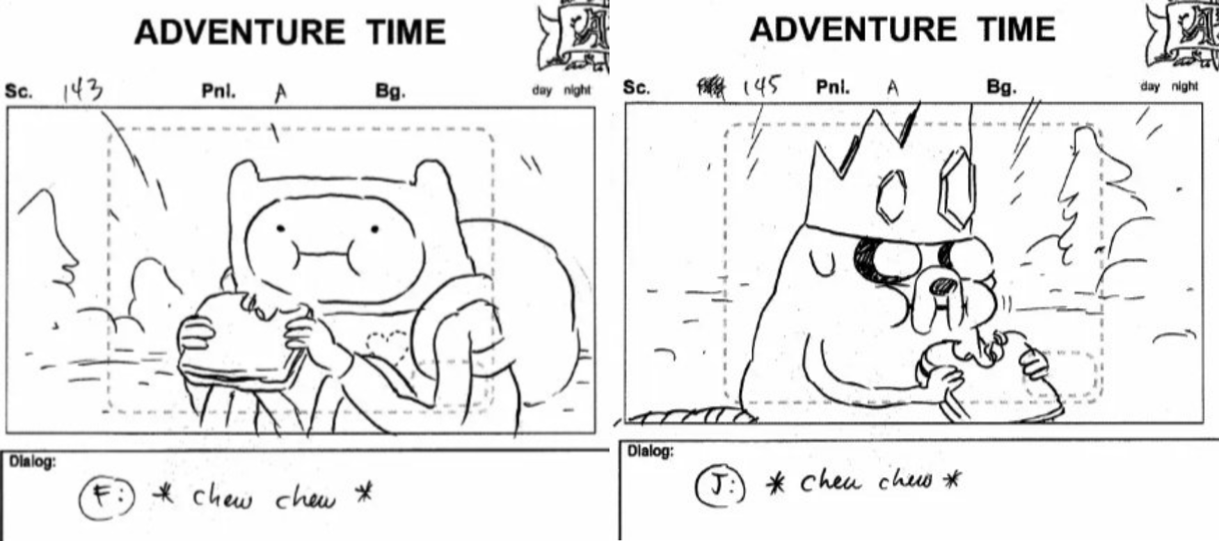 >>151015183Reminded me of this articlehttps://www.latimes.com/entertainment/tv/la-ca-adventure-time-oral-history-20180823-htmlstory.html>Ward: I thought at first we were going to control it more with a script. I thought it’d take less time to write than to draw it. The first thing I wrote was “Finn and Jake make funny faces at each other." And that was the most boring thing.>Muto: In "The Prisoners of Love,” there’s a scene with the Ice King carting Finn and Jake; he’s pushing them up a hill. And he takes a break and pulls out trail mix and eats it. And the slowness of it, and the calmness of it — you could put it in a script, like, “He takes a break and eats trail mix,” and it would just get cut. But in a board, you can feel why it's right. It gives that he’s not just a pure villain, he’s a real guy and he’s just eating his trail mix, and he wants that last yogurt chip, he has to reach down and get it with his fingers.>Jones-Quartey: Pen would often set me loose and say, “Create something special for this moment.” The first time you see Finn’s hair on the show, that was a scene that I storyboarded myself. In “Mortal Folly,” where we finally get to see a great mushroom bomb, the way it turns into a huge mushroom cloud of skulls, that was something I created.