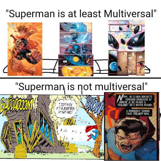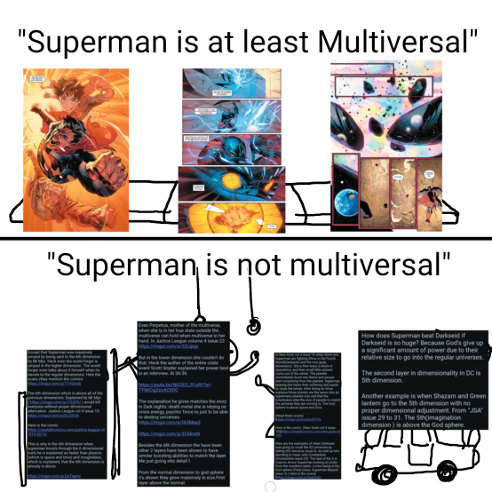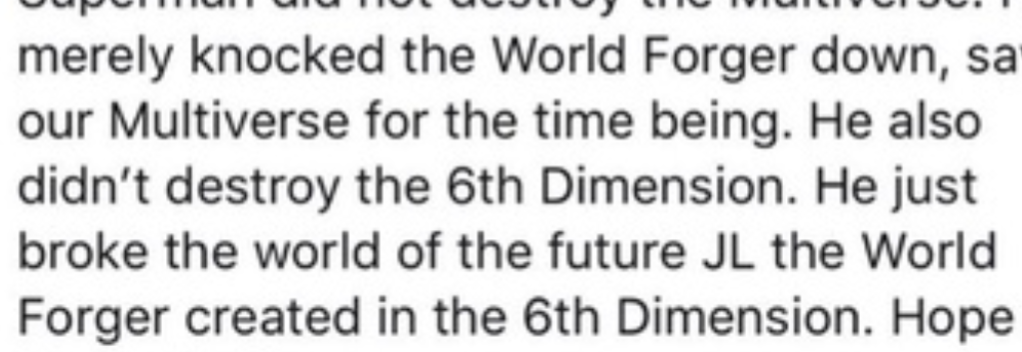 >>151014124Why would Superman destroy the Multiverse? All he needed to do was destroy a 6th dimensional universe. Also the 6th dimension is beyond space, imagination, time, magic, cosmology, and abstract.The first 3 Dimension = All Spatial DimensionThe 4th Dimension = Gods, Magic, and the AfterlifeThe 5th Dimension = ImaginationThe 6th dimension = Concepts, Abstracts, and Beyond