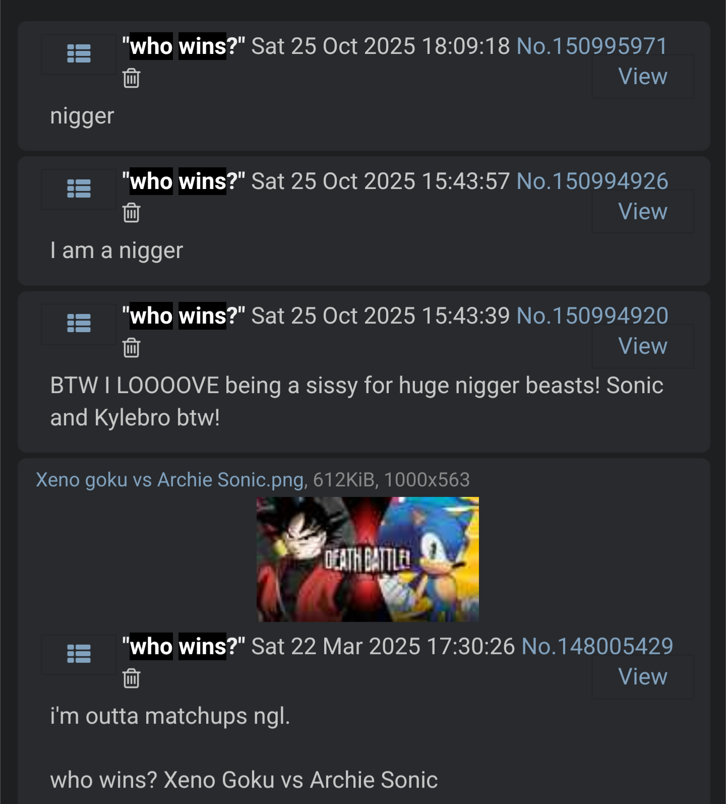 I honestly hope all of you Deathbattlespics get tortured slowly in horrific, agonizing pain until death. All of you are subhuman cockroaches that should be genocided