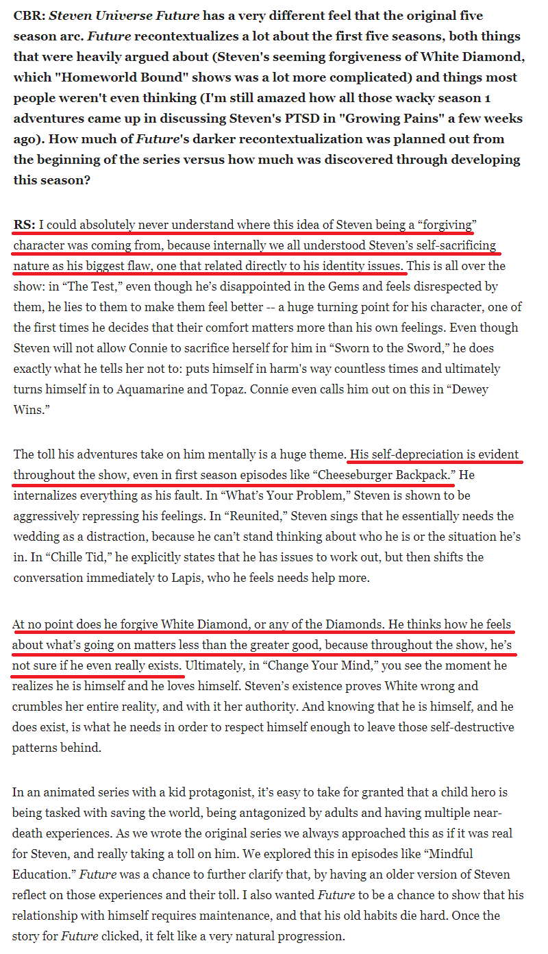 >>151022379Show, don't tell. They couldn't make the PTSD and general psychological trauma work with the show they already made. So they resorted to directly telling the audience a conflicting story, because it doesn't work otherwise. Steven spent the entire series exploring his own problems and coming to terms with them, most often in healthy and constructive ways. Then they wanted to do a "mature" show about "serious" topics, so they contrived some additional mental trauma that just didn't come up during the seasons he spent sorting out all that other trauma.If you think anything about SU Future holds up, you're retarded and gullible. You needed them to tell you what to think, because you're incapable of analyzing what the show actually said and did with its characters.