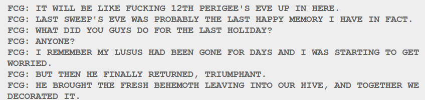 >>151042104Perigee's Eve, the trolls equivalent to Christmas, is them having to decorate literal behemoth leaving. The lusus would go out to get it for the trolls, coming back home to show they survived getting it.https://www.homestuck.com/004467