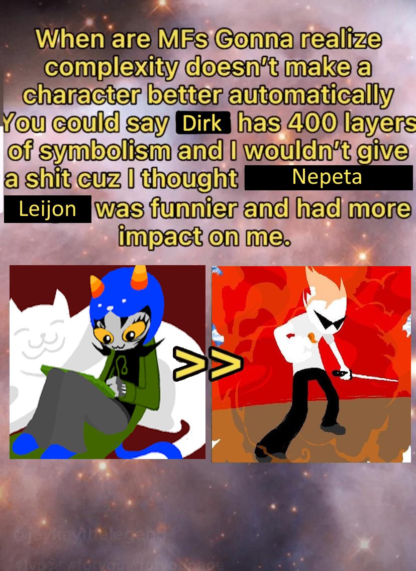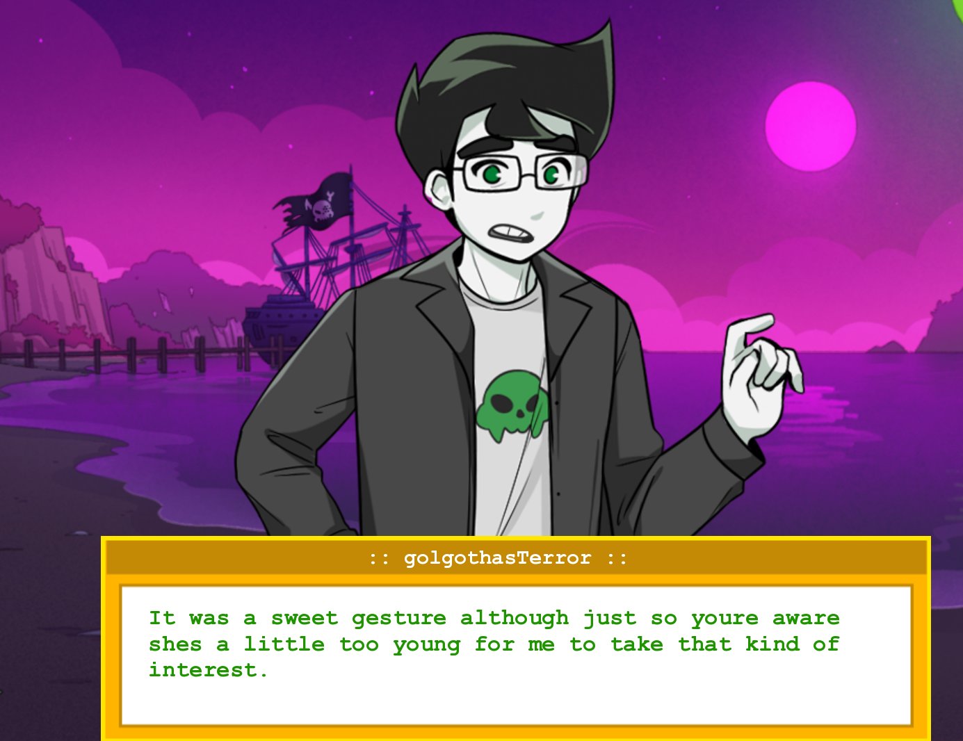 >>151042121The skaianet files were garbage Hussie never even wanted to publish. There are ways to read the comic that imply that she genuinly loved Sassacre and thats what I chose to believe. Fuck the skaianet files