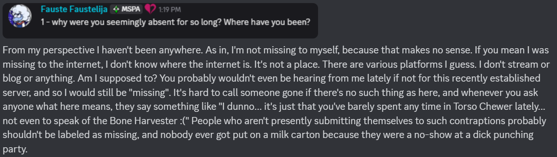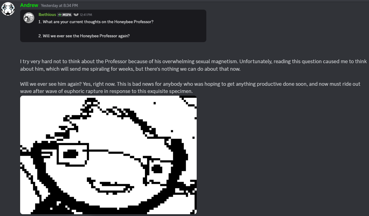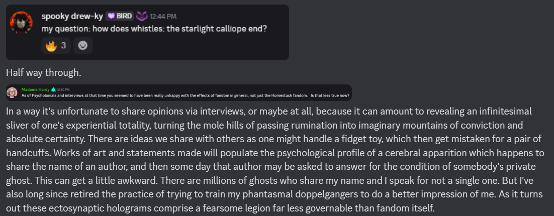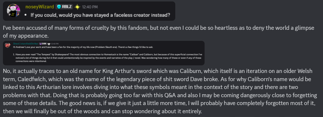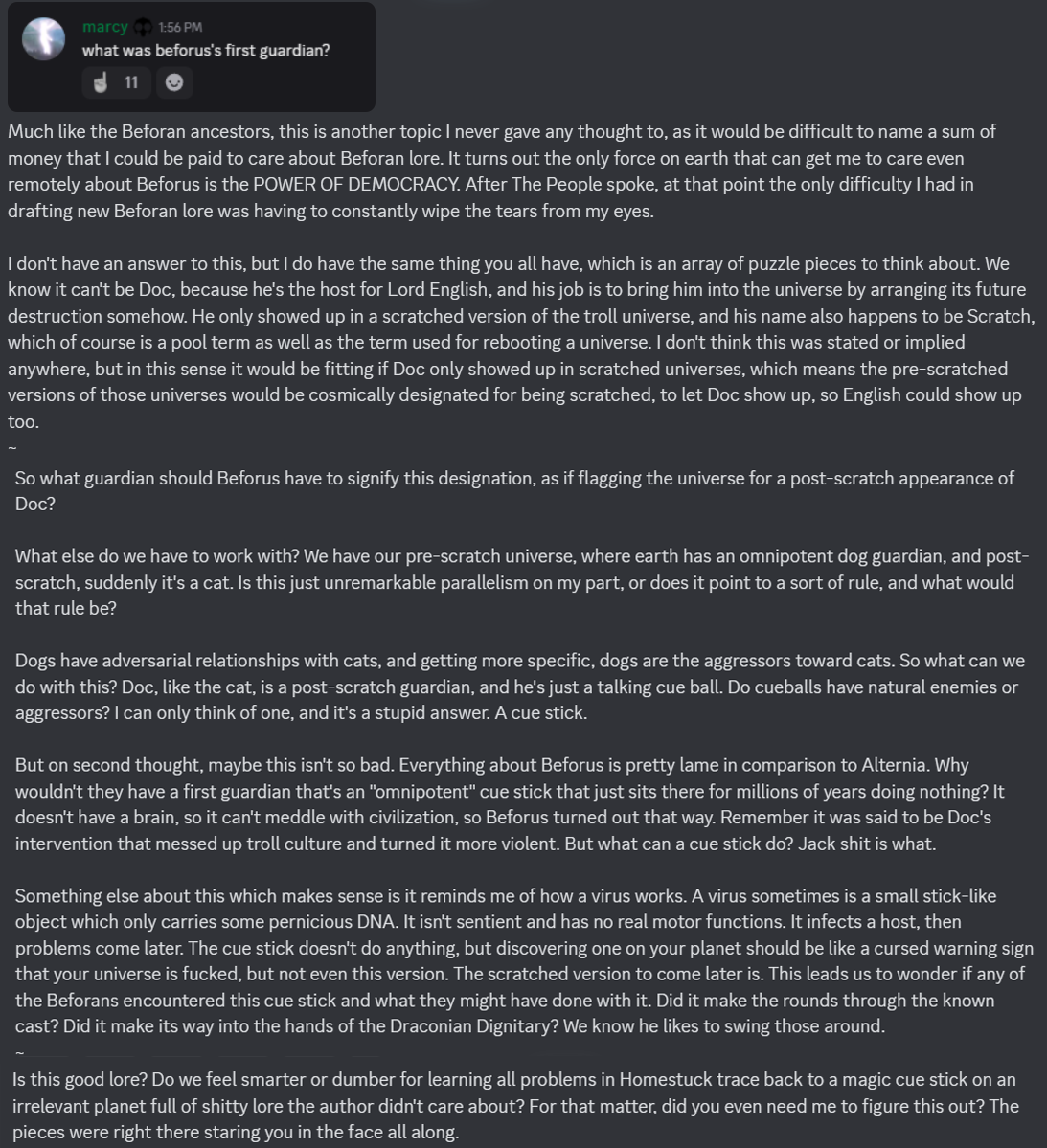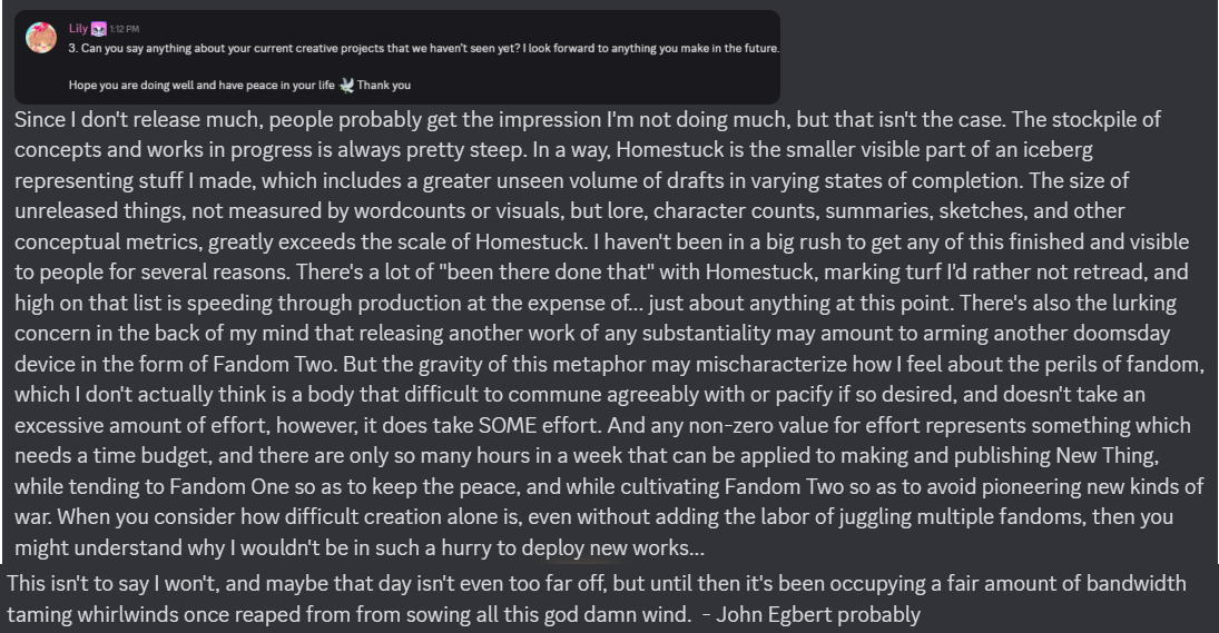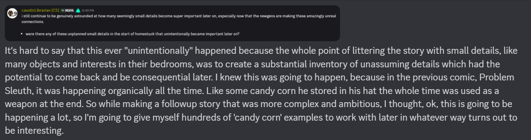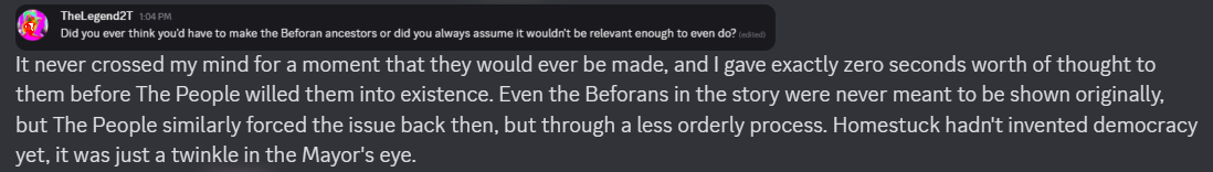 >>151057350>>151057321It is a little funny that throughout this Hussie has been pretty candid about not knowing shit until the moment it's introduced, or not giving certain things any thought until people ask, but for this he goes "Yeah nah Dave was getting his ass whooped". Which only gives it more credence in my mind.