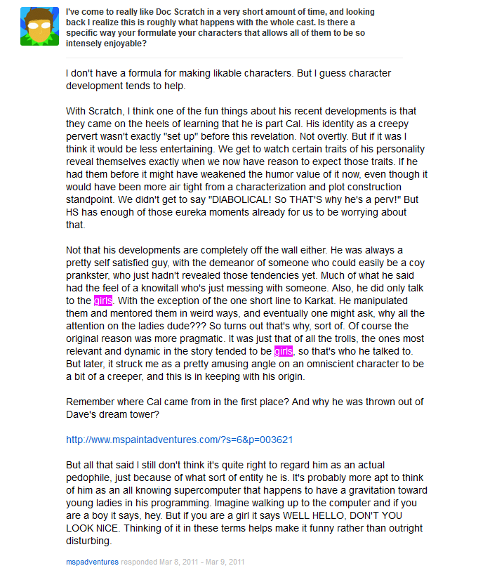 >>151041776Per Hussie, he's like a machine programmed to target young girls, and, also per Hussie, that's not weird in any way.