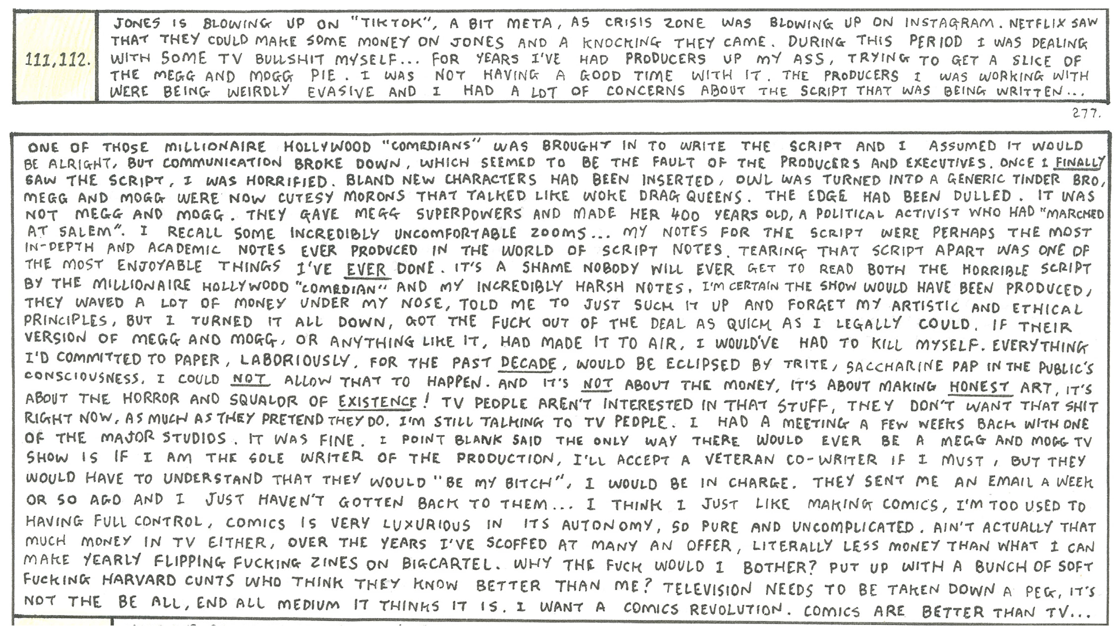 I know Hanselmann really wants to make and MMO show, but I seriously don't think it could match the same feel of the comics. The short he did a few years ago was fine, but I dunno, something about the strip being animated robs it of that greasy, relatable feel. Fuck I just wish he'd release Megg's Coven already.